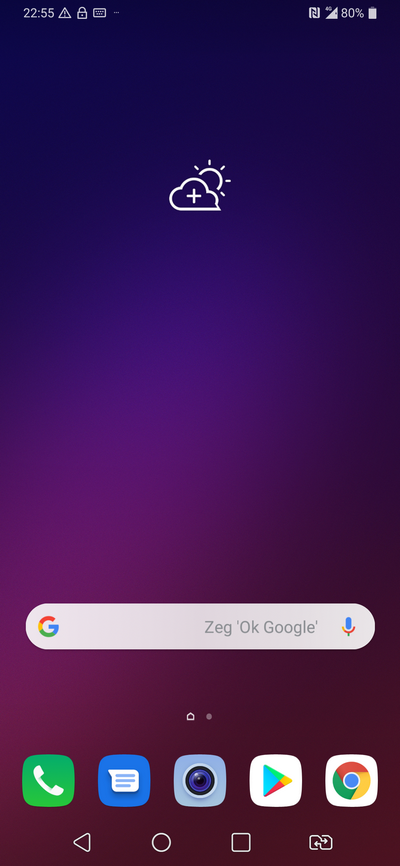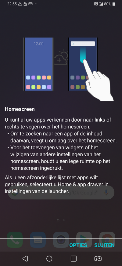 We komen meteen in het homescreen terecht. Deze ziet er meteen behoorlijk strak uit. Natuurlijk is het mogelijk om de achtergrond en de knoppen allemaal aan te passen. Als je een keer naar beneden swipet, dan krijg je ook uitleg over het homescreen. Als je naar rechts swipet, krijg je de geïnstalleerde apps te zien. Swipe je naar beneden, dan krijg je een overzicht te zien van ej recente activiteiten en de apps die je pas geopend hebt. Hierin staat ook dat je de app drawer kunt aanpassen naar een afzonderlijke lijst met apps. Het scherm wat naar beneden komt is vrij standaard. Sowieso levert LG niet al teveel apps mee die je niet wilt. LG Health staat geïnstalleerd, net als LG Smartworld, RemoteCall Service en Cell Broadcast. Ook Smart Doctor en LG Mobile Switch staan er op.