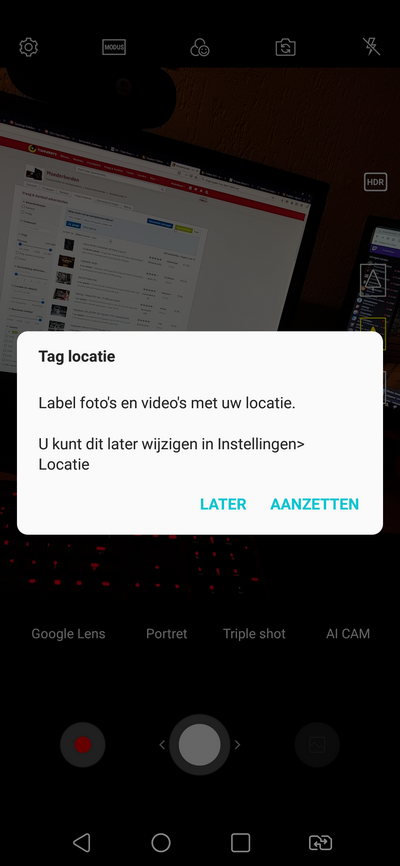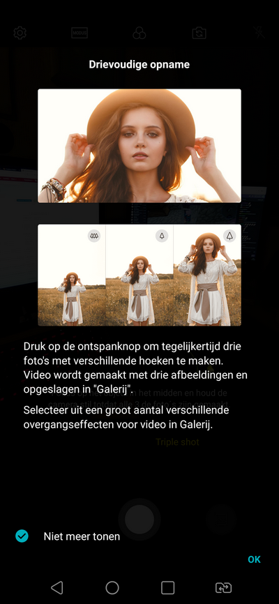 Op het moment dat je voor het eerst een foto wilt gaan nemen, krijg je nog een tip over het taggen van foto's en video's. Zo is het mogelijk later te zien waar de opname gemaakt is. Ook over de Triple shot wordt al een hint gegeven, hier later meer over. Deze opties zie je ook maar één keer.