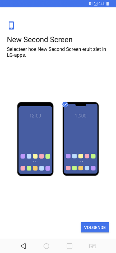 De eerste stappen van de installatie zijn het installeren van de SIM-kaart, het instellen van de internetverbinding, het controleren op updates en het inloggen op Google. Echter het tweede scherm wat je krijgt is de optie om de weergave van het second screen in te stellen. LG heeft een hoesje ontwikkeld waar een tweede scherm op getoond kan worden en met deze optie stel je dus in hoe het scherm eruit moet komen te zien.