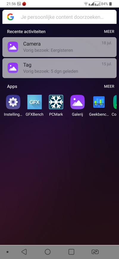 Als de telefoon weer opgestart is, kom je terug in het beginscherm. Hier staan alle applicaties in het homescreen. Wil je dit niet, pas dan de instelling aan naar app drawer. Swipe je vanaf de bovenkant van het scherm naar beneden, zijn meteen de knoppen terug te vinden waarmee bijvoorbeeld Wi-Fi of de mobiele verbinding uit te schakelen zijn. Ook is te zien welke van de twee simkaarten actief zijn als er ook daadwerkelijk twee kaarten geplaatst zijn. Swipe je halverwege het scherm naar beneden, dan kom je in het scherm met de recente activiteiten en applicaties. Ook kan hier gezocht worden naar content die op je telefoon staat.