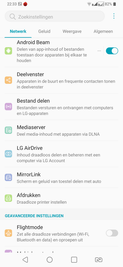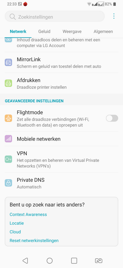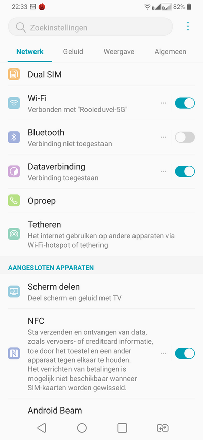 Hier nog een overzicht van het instellingen menu. Anders dan bij mijn Oneplus 6 is hier gekozen voor vier verschillende tabbladen met de daarbij behorende instellingen. De groepen zijn Netwerk, Geluid, Weergave en Algemeen. Bij Netwerk staan de instellingen die betrekking hebben op het telefonie netwerk, de Wi-Fi verbinding, Bluetooth en Tethering. Ook kan hier met verschillende apparaten verbinding gemaakt worden om data uit te wisselen of beelden naar een ander apparaat te sturen. Tevens is printen vanaf de telefoon mogelijk. Flight mode mag hier niet ontbreken, aangezien mobiele telefoons niet aan mogen staan in vliegtuigen. Bij Dual Sim kunnen de instellingen van de twee simkaarten aangepast worden. Zet de kaart van werk uit als je vakantie hebt of selecteer welke kaart gebruikt moet worden voor de data verbinding. Ook Roaming kan hier ingeschakeld worden.
