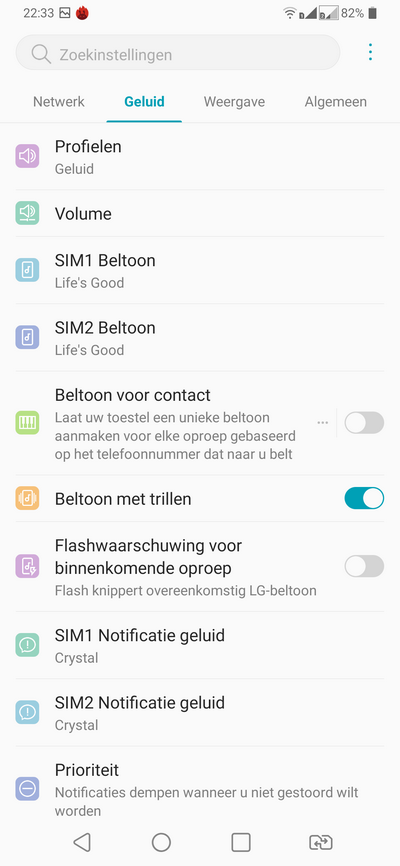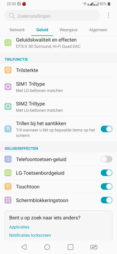Onder geluid vinden we de instellingen voor de verschillende beltonen en notificatie geluidjes. Tevens kan ingesteld worden dat het LED lampje gaat knipperen op het moment dat je een oproep krijgt. Verder kunnen de DTS:X en Hi-Fi Quad DAC opties aangepast worden. Wil je geen geluiden als je toetsen in drukt? Dan kan dat hier gewoon uitgezet worden.