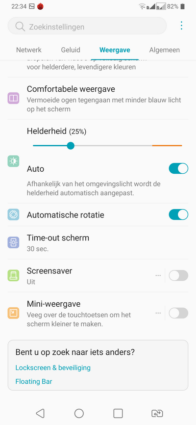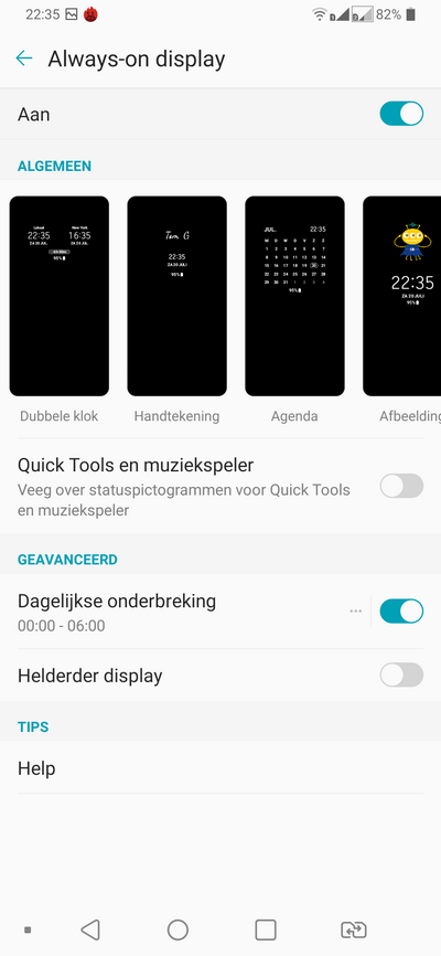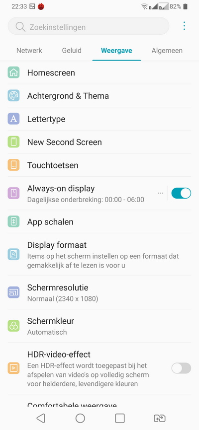 Bij Weergave pas je het uiterlijk van de schermen aan. Denk aan het homescreen, de achtergrond, de lettertypes en de resolutie. Gaat het scherm te snel op standby, dan kan deze tijd hier veranderd worden. Ook de screensaver is hier in te stellen. Wat misschien nog wel de leukste feature hier is, is het always on display. Dit is voor een gedeelte aan te passen door een plaatje of een GIF bestand te selecteren. Deze zal dan getoond worden als het toestel in stand-by mode staat.