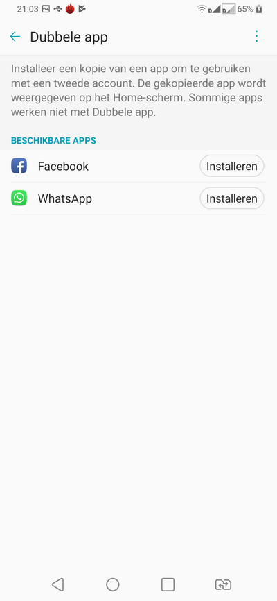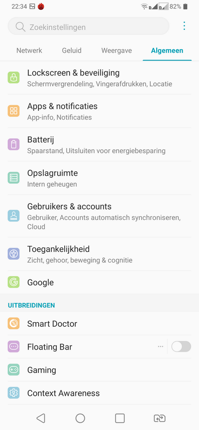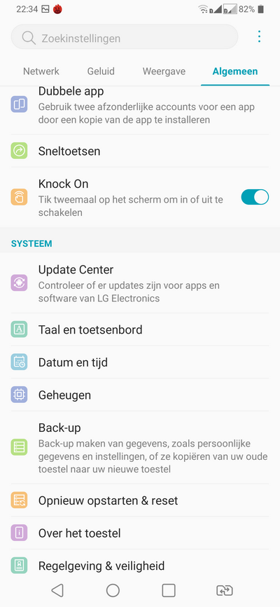 Bij Algemeen staan alle overige instellingen van het toestel, zoals de manier hoe het toestel ontgrendeld moet worden, welke applicaties een waarschuwing mogen geven, informatie over het geheugenverbruik of de verschillende accounts die op het toestel gebruikt worden. Ook stel je hier de dubbele apps in. Aangezien er twee simkaarten gebruikt kunnen worden, is het ook wel handig als er twee instanties van Whatsapp geïnstalleerd kunnen. Tevens zijn updates hier te downloaden.