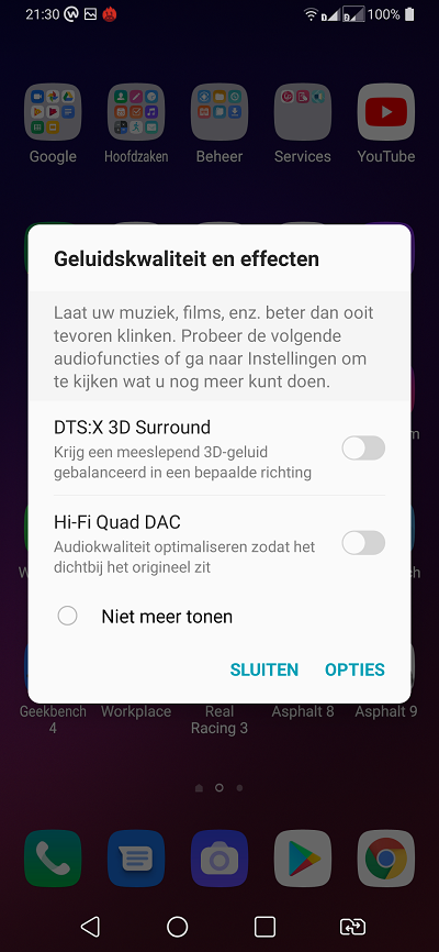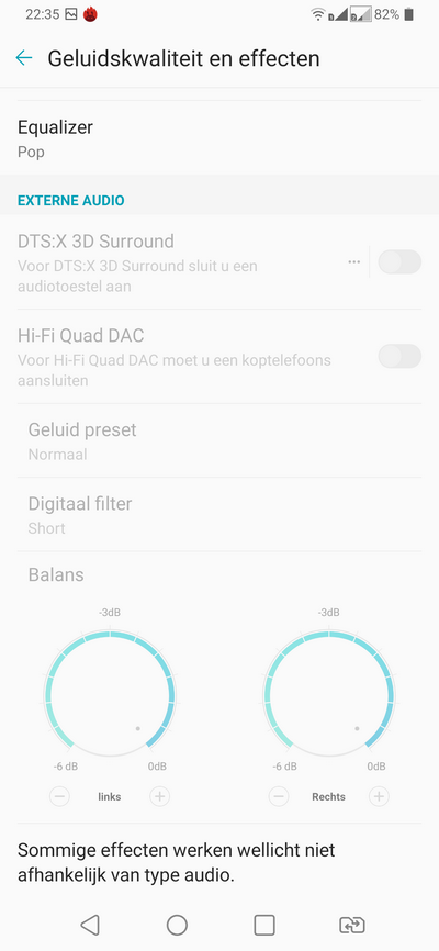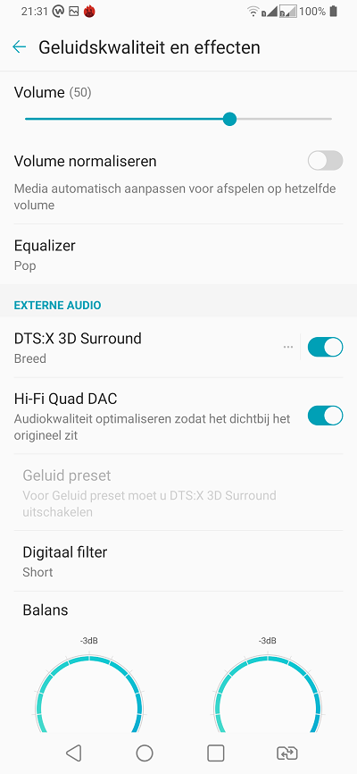 Audio klonk via de speaker redelijk, maar hier hebben veel telefoons last van. Je merkt ook dat er nog een beetje geluid uit de speaker aan de voorkant komt. Dit doet echter heel erg weinig voor de ervaring. Sluit je een hoofdtelefoon aan, dan komen de audio opties zoals DTS:X en Hi-Fi Quad DAC om de hoek kijken. Voor films kan de DTS optie prachtig zijn maar met muziek is dit toch wat minder prettig om aan te horen. Gelukkig zijn er met het Quad DAC genoeg opties om te spelen met het geluid en instellingen aan te passen om het geluid zo goed mogelijk naar je zin te krijgen.