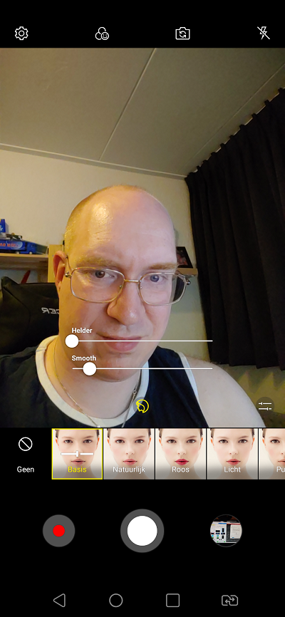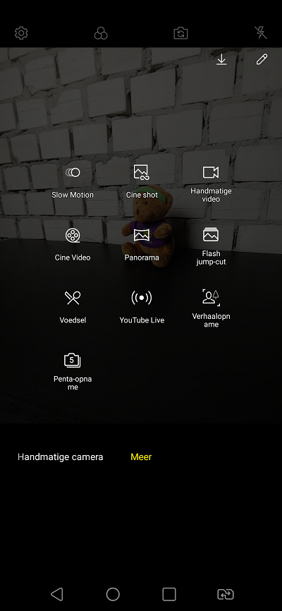 Bij de twee camera's aan de voorkant is het ook mogelijk om te wisselen tussen de twee lenzen. Er is een keuze tussen de standaard lens en de Groothoek lens. Verder zijn er opties aanwezig om filters toe te passen op het gezicht of de helderheid aan te passen. Ook is hier een video opname aanwezig, mocht je een video willen maken en op het internet willen zetten.