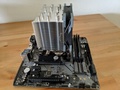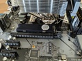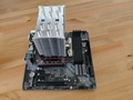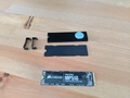 Als dat allemaal gelukt is kun je beide warmte geleidings reepje op de Corsair NVMe drive leggen. Een aan de bovenkant en de het 2e reepje aan de onderkant. Vervolgens leg je de heatsink er bovenop en de backframe van de heatsink onder de NVMe drive. Dan als laatste en ook tevens een lastige klus is alles bij elkaar bevestigen met de klemmetjes.