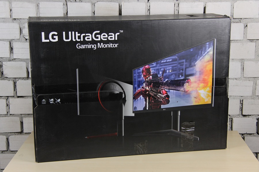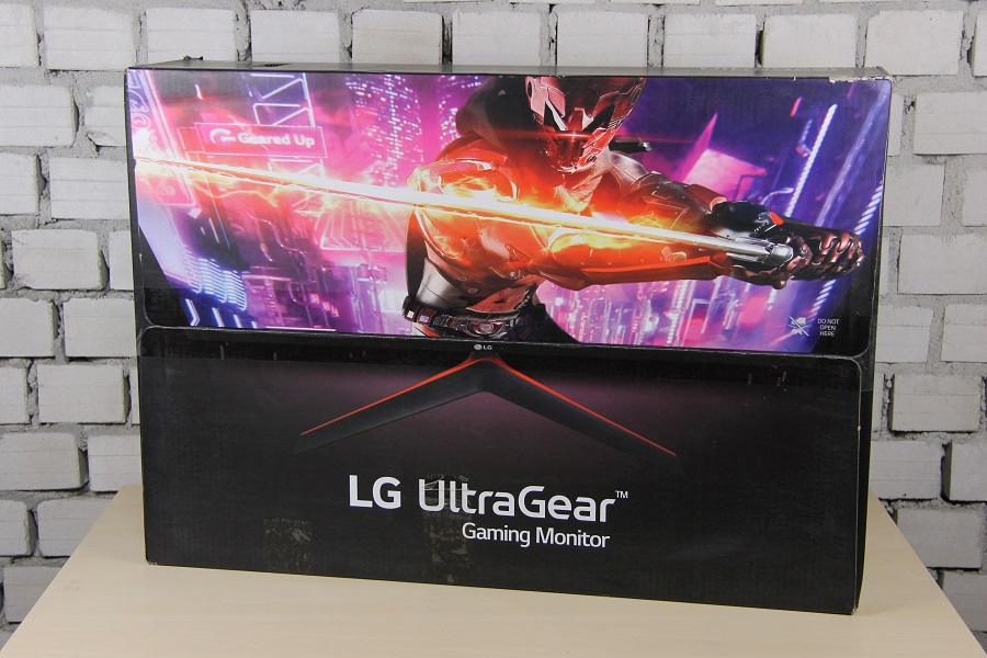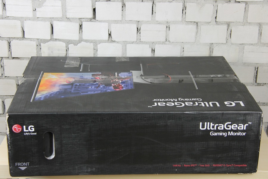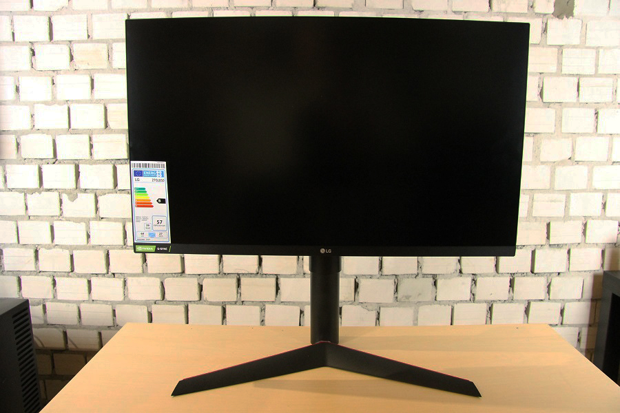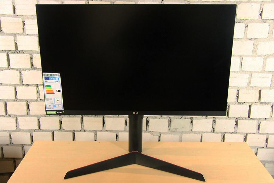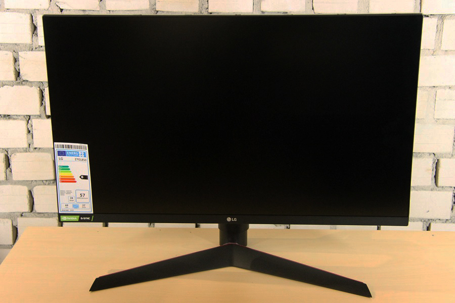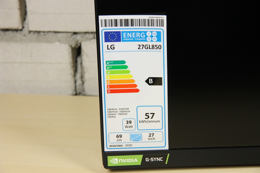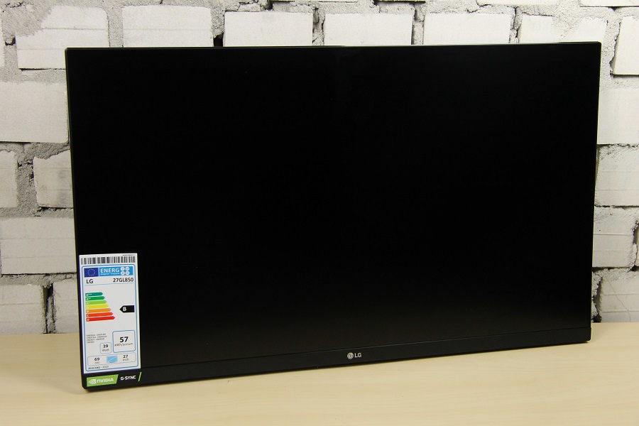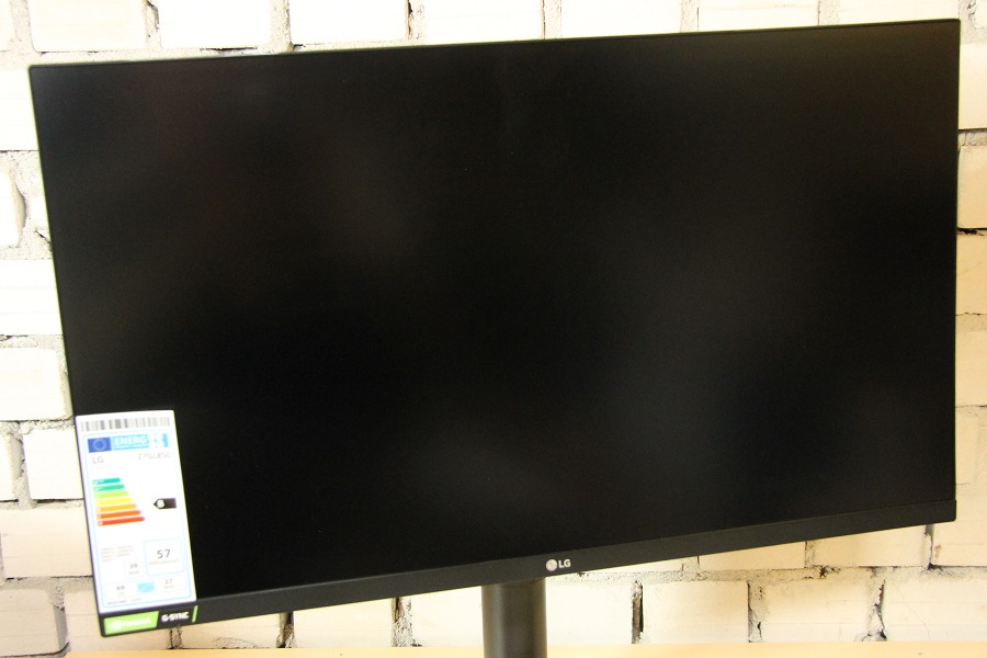 Tijd om het paneel te bekijken voordat deze op de voet vastgezet wordt. Nu kan deze nog bekeken worden voordat er van alles in de weg hangt. Aan de voorkant van het paneel zien we een zwart geheel met aan de onderkant nog iets van een rand. Links onder bevindt zich een sticker met het energie verbruik van het scherm wat tegenwoordig verplicht is om weer te geven. Verder zit er nog een sticker dat laat zien dat het scherm ondersteuning biedt voor G-Sync. Als laatste mag het logo van LG niet ontbreken.