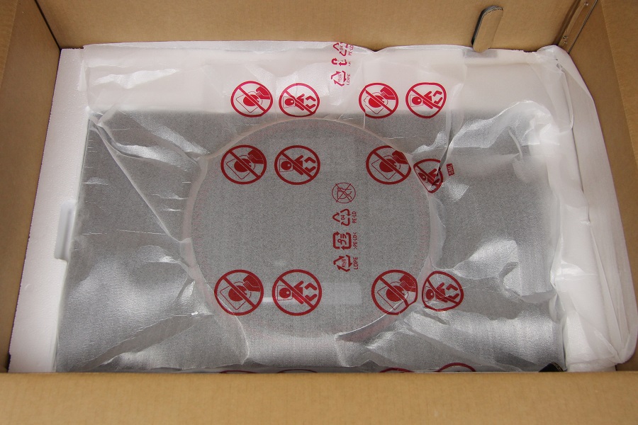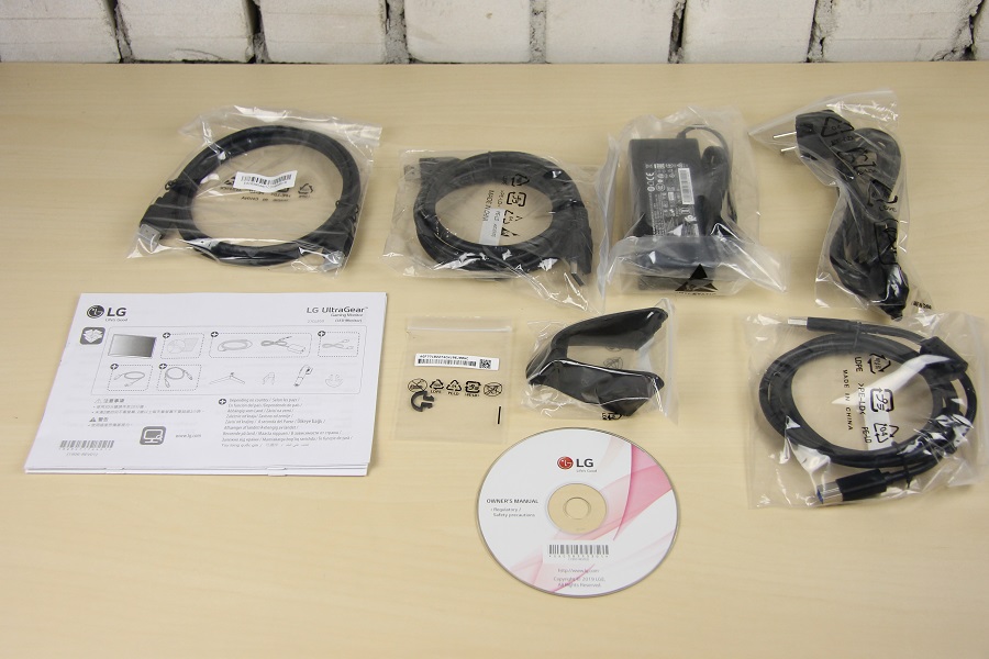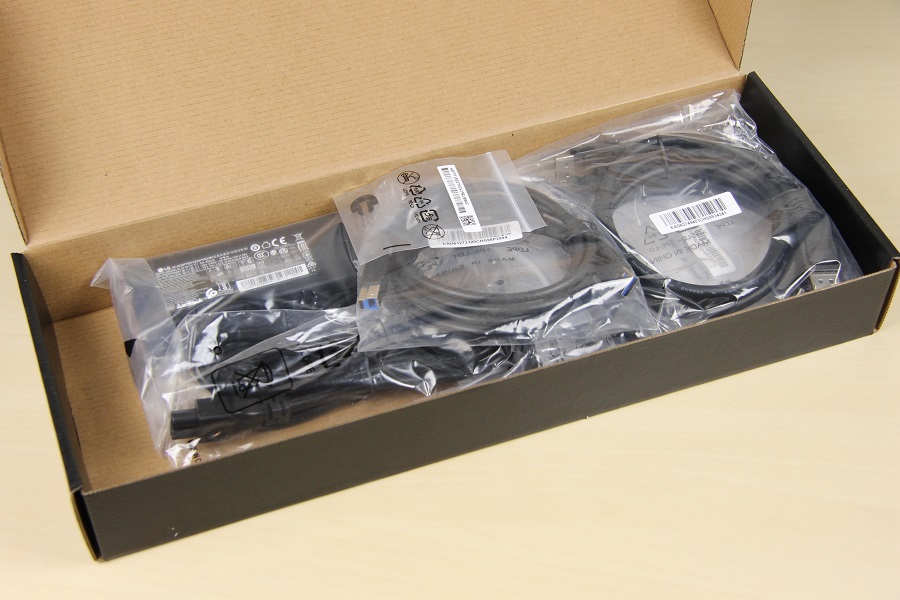 Pakken we er een mes bij om de doos open te maken, ook al staat er op de doos dat dit niet wenselijk. En met reden: er bestaat een kans dat je wat kapot snijdt. Overigens moet je ook goed opletten welke kant je open maakt, anders heb je eerst het scherm te pakken in plaats van de accessoires. Vouwen we de doos open dan zien we daar de boet, de beugel en een doos met accessoires. Een vrij grote doos op het eerste gezicht. Ook wel nodig, want hier zitten de nodige kabels en de voedingsadapter bij. Ook vinden we een cd en een kabelgeleider terug. Tillen we de laag piepschuim op, zien we het scherm zelf terug verpakt in foam.