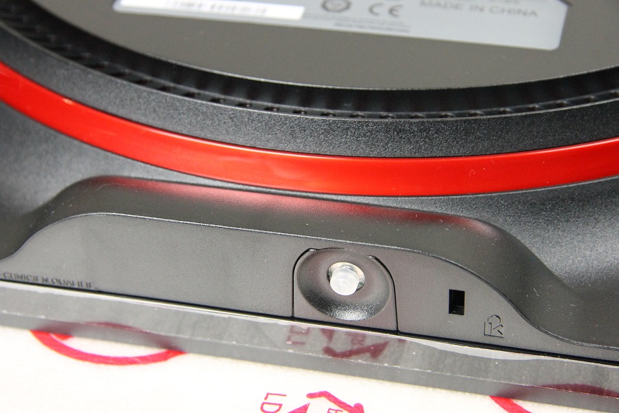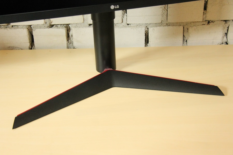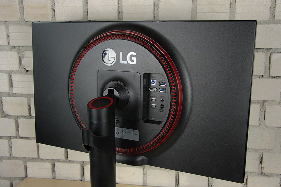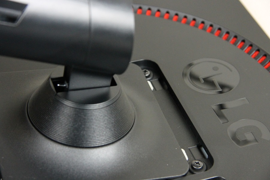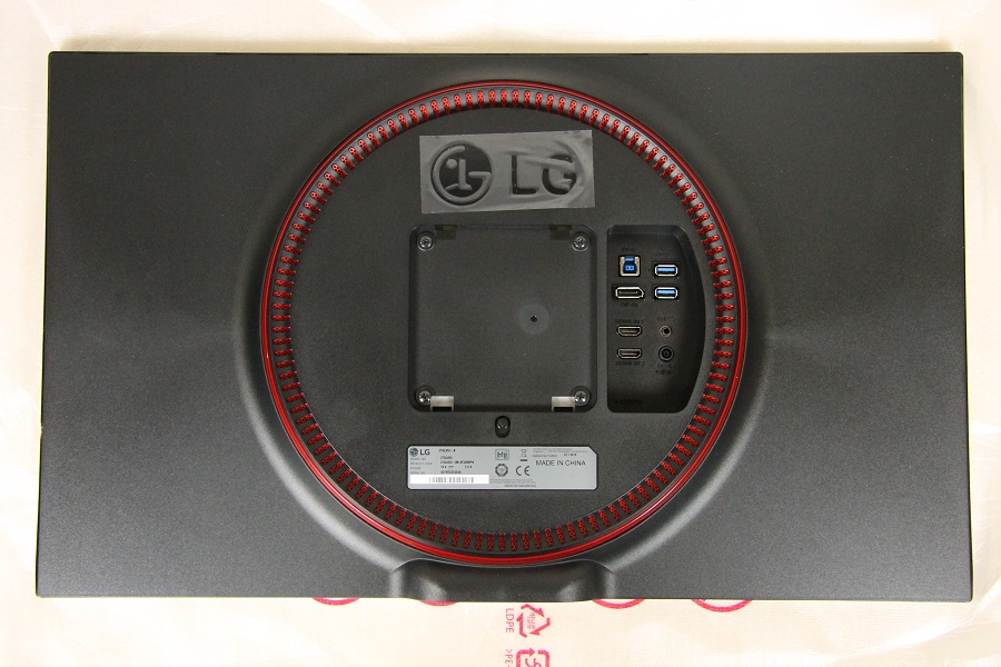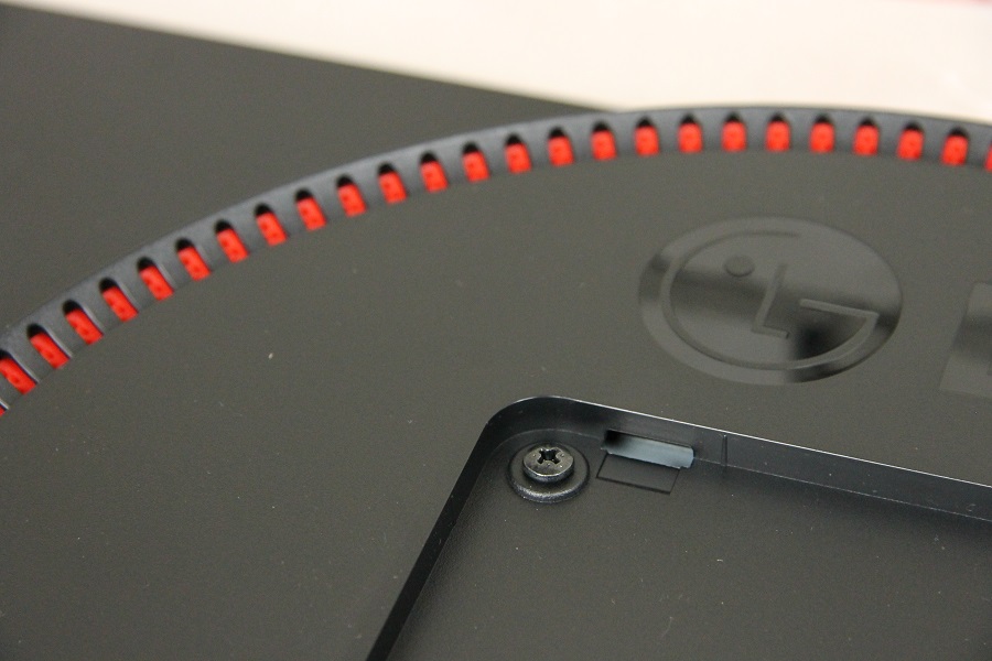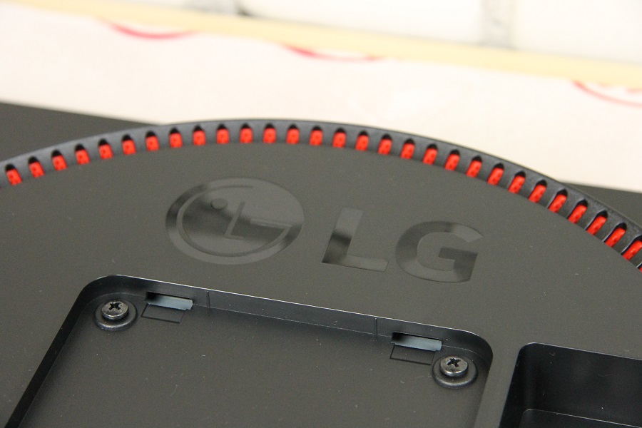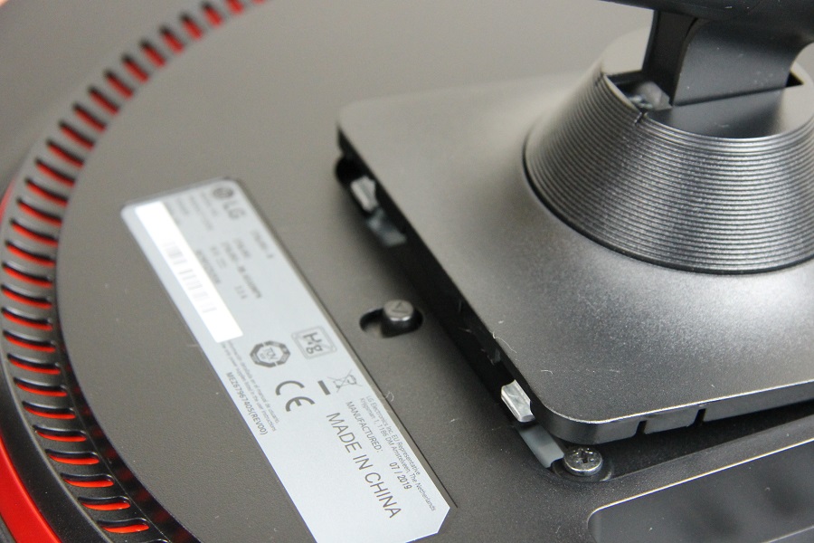 Gaan we naar de achterkant kijken dan valt meteen de rode rand in het midden op. Dit is een mooi accent op de monitor die voor de rest helemaal zwart gekleurd is. Onderaan zien we het typeplaatje met daarop de informatie van de monitor zoals het typenummer en fabricagedatum. Ook staat hier op hoeveel stroom het scherm nodig heeft om te kunnen werken. Tevens is de vesa poort terug te vinden. Hier kan de geleverde voet in geklikt worden maar het is ook prima mogelijk om zelf een andere voet op het scherm te schroeven. Bovenop het scherm zien we het LG logo in het groot gedrukt in het scherm. Als laatste vinden we onderop het scherm een Kensington slot poort en een joystick om de verschillende opties van het scherm mee te bedienen.