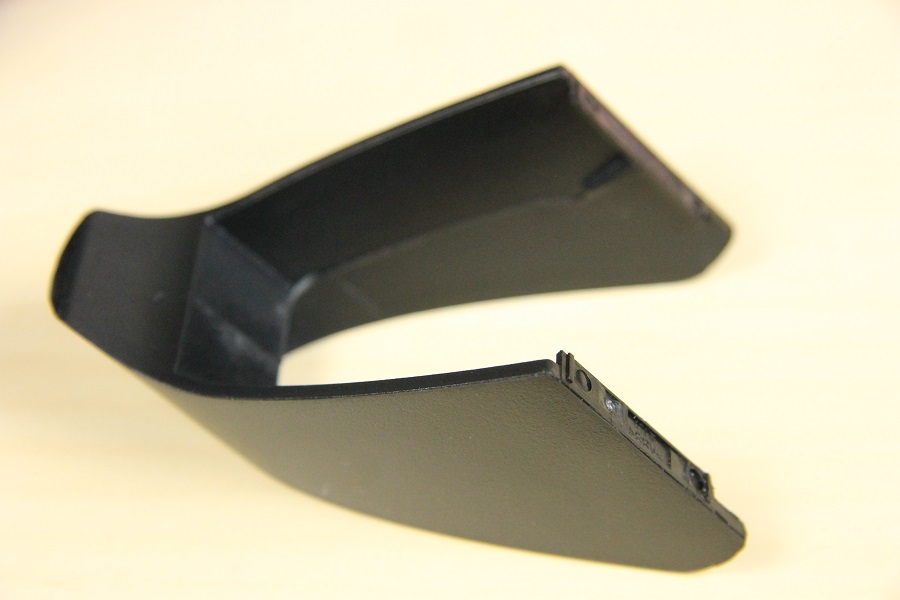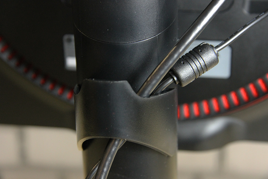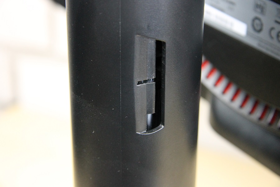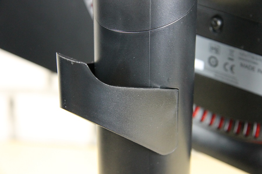 Tijd om het scherm aan de voet vast te klikken. Dit is vrij eenvoudig te doen. Schuif de twee bovenste pinnen van de beugel in het scherm en duw de beugel op zijn plek. Het scherm zit nu goed vast aan de voet. Mocht je het scherm ooit los willen halen dan is dit mogelijk door de pal onder het montage gedeelte naar beneden te duwen. Zo komt het scherm weer los te hangen. LG levert ook een kabel geleider mee die op de beugel vast te klikken is. In de beugel zitten twee sleuven waar de plastic geleider makkelijk in te klikken is. Als deze op zijn plek zit dan kunnen de kabels daar langs geleid worden.