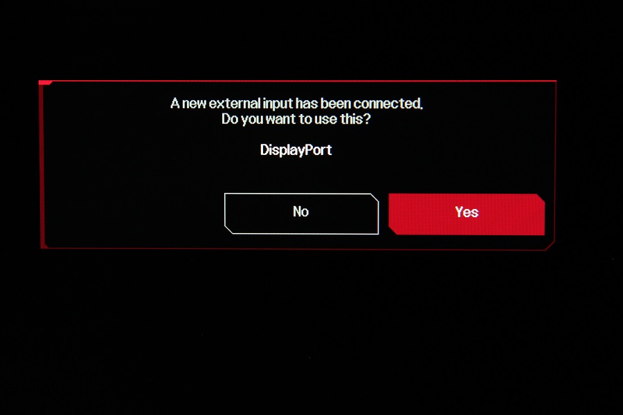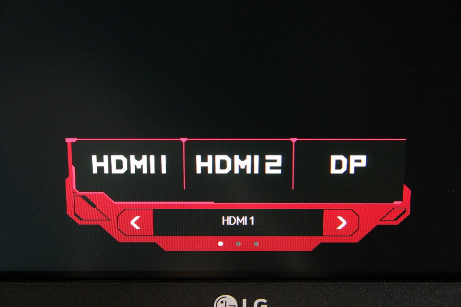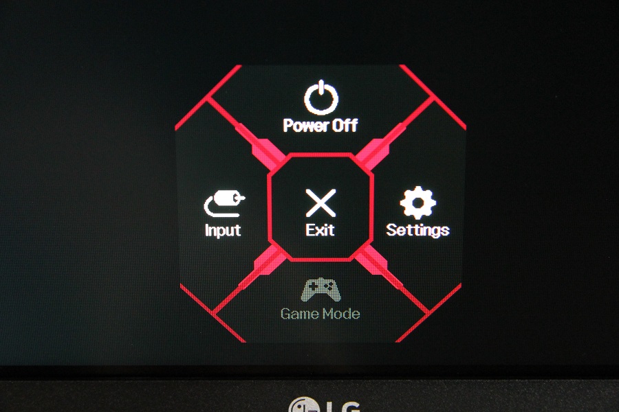 Natuurlijk mag op dit scherm een On Screen Display niet ontbreken. Als je op de knop onderop het scherm drukt komt er een klein menu in het midden van het scherm tevoorschijn. Hierin zijn vijf keuzes mogelijk: Power Off, Input, Game, Settings en Exit. Afhankelijk van de richting die je de stick op stuurt, wordt het betreffende item gekozen. Druk je de knop in, verlaat je het OSD weer. Dit is redelijk standaard bij LG maar bij dit scherm is er gekozen voor een wat stoerder uiterlijk.
