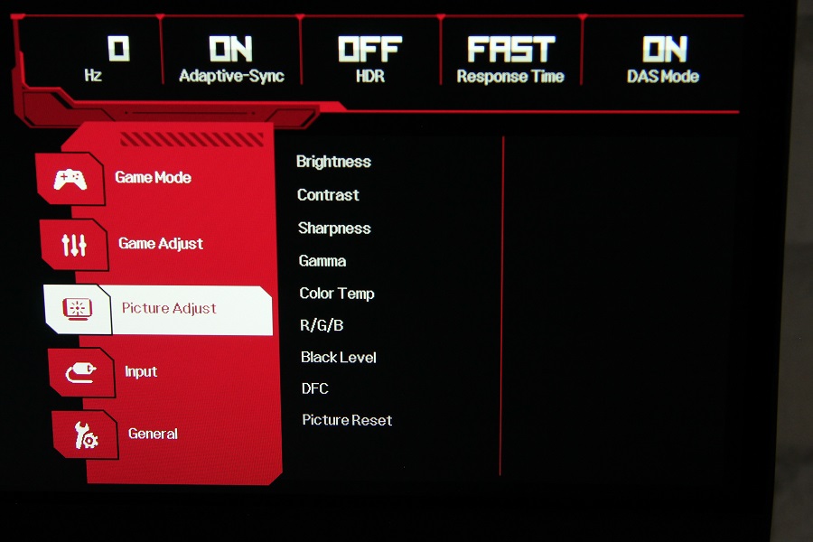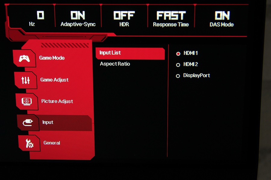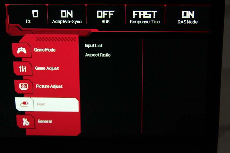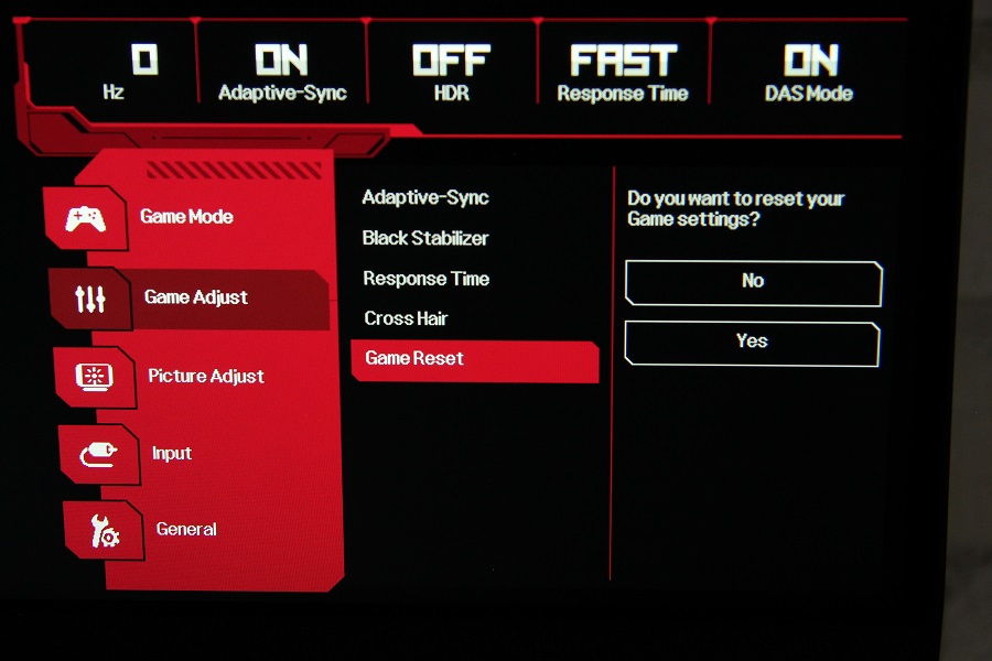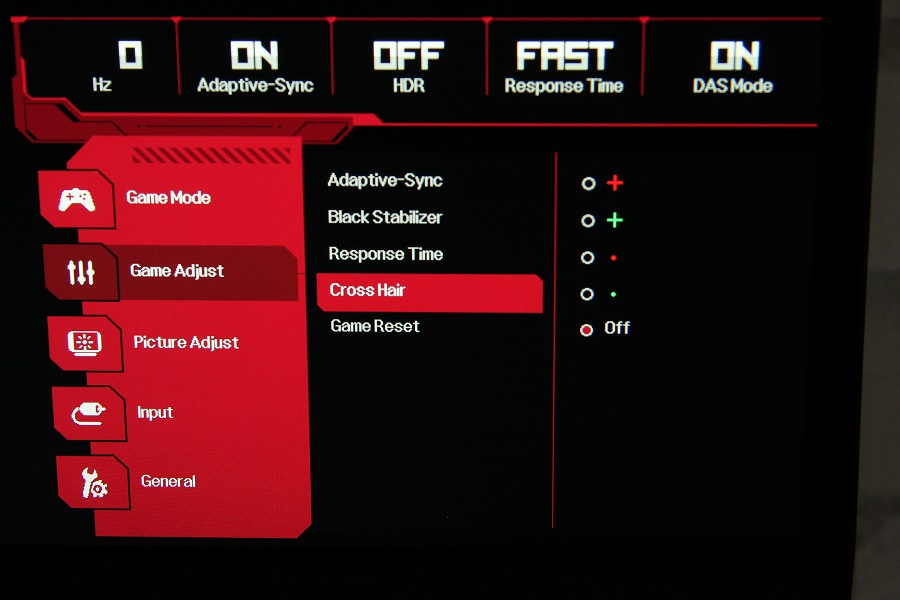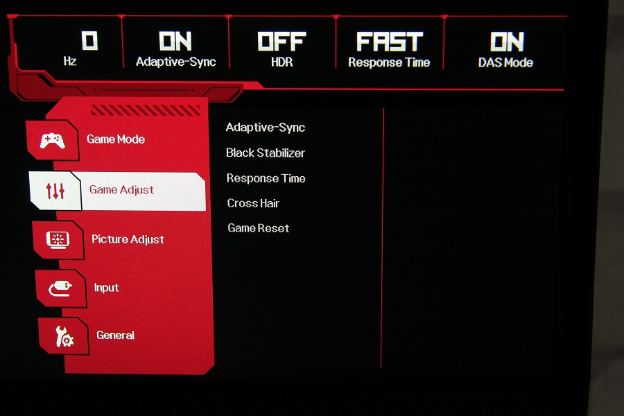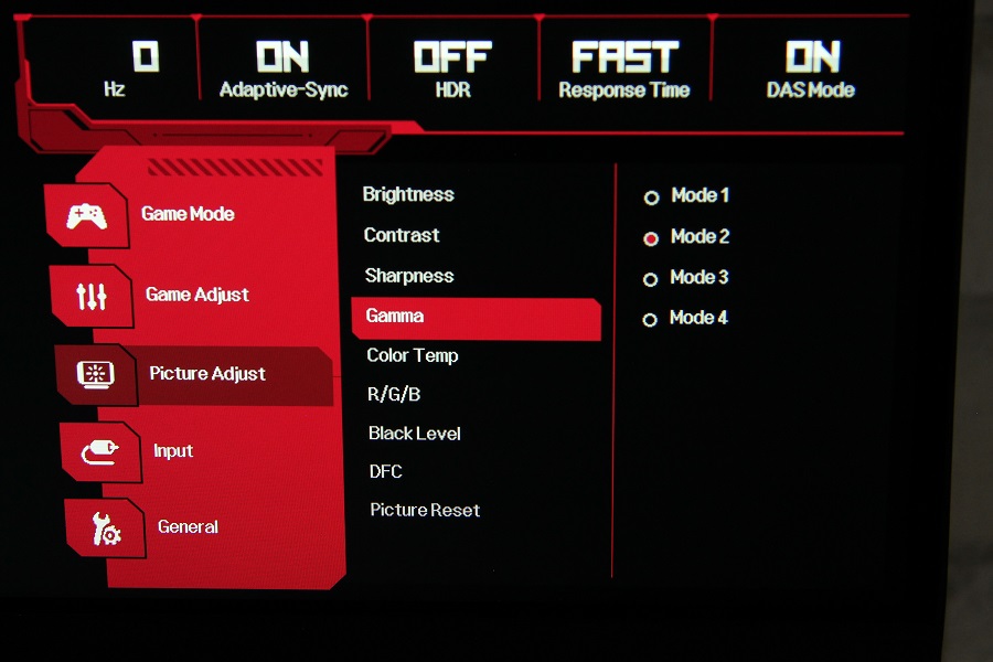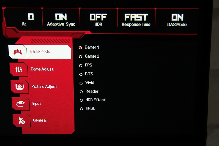 Daarnaast zijn er in het OSD vijf verschillende schermen beschikbaar: Game Mode, Game Adjust, Picture Adjust, Input en General. We gaan even kort door de schermen heen die beschikbaar zijn.
