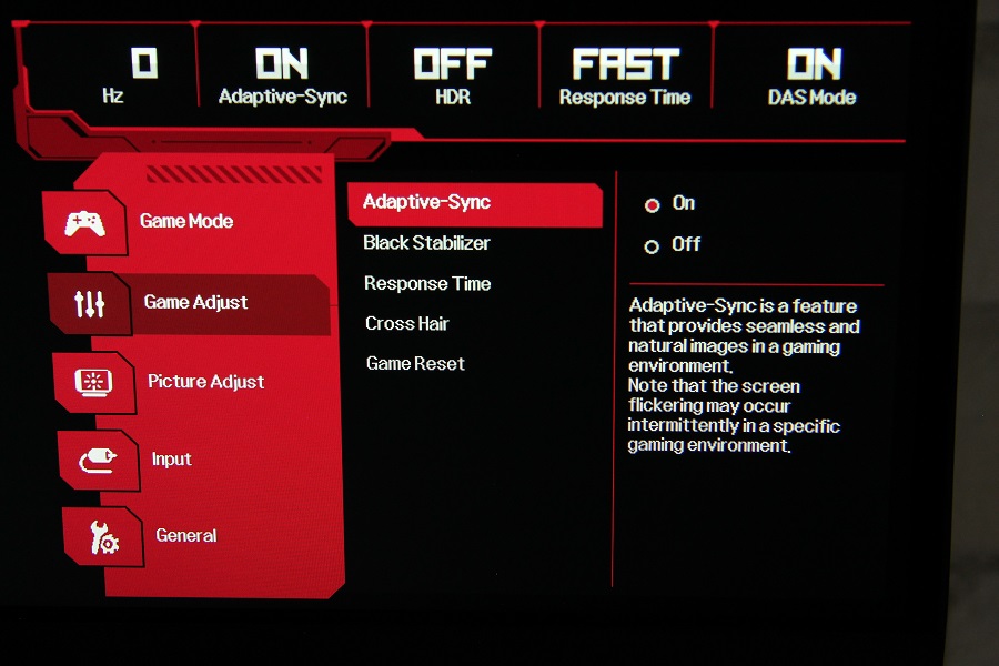 Andere zaken die op het scherm aanwezig zijn zijn bijvoorbeeld ondersteuning voor G-Sync en Freesync (of Adaptive Sync). Deze techniek zorgt er voor dat het beeld vloeiend weergegeven wordt en niet gaat haperen en verschillende delen langs elkaar gaan lopen. Ook heeft het scherm een refresh rate van 144Hz. Dit zorgt er voor dat het beeld duidelijker en soepeler wordt weergeven. Het scherm ververst het beeld niet meer 60 keer per seconde maar 144 keer per seconde. Dat betekent dat het beeld veel sneller bijgewerkt wordt. Als laatste Zijn er de Black Stabilizer die zorgt dat donkere omgevingen lichter getoond worden zodat verborgen items makkelijker zichbaar zijn. Ook is er een "gimmick" aanwezig in de vorm van een crosshair wat op het scherm geplaatst kan worden in plaats van in het spel. Deze zit altijd in het midden en geeft je zo een mogelijkheid om te mikken terwijl het spel het officieel niet toe laat. Je zou dit ook een vorm van "valsspelen" kunnen noemen.