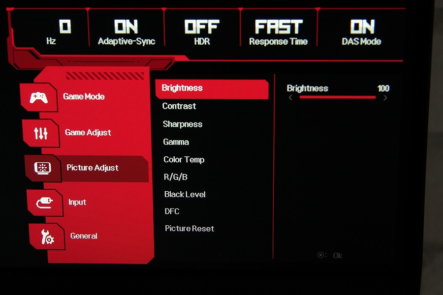 Het OSD van het scherm is makkelijk te bedienen en zit relatief eenvoudig in elkaar. Hier lijkt er een "Gamer" sausje overheen gegoten te zijn: strak met rode tinten, wat ik persoonlijk geen probleem vindt en mooi past bij de voet. De bediening gebeurt met één pookje. waarmee je navigeert door het menu. Tevens zijn hiermee ook de helderheid en de volume voor de hoofdtelefoon aan te passen.