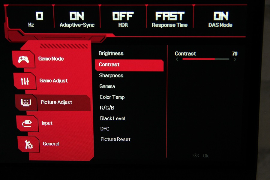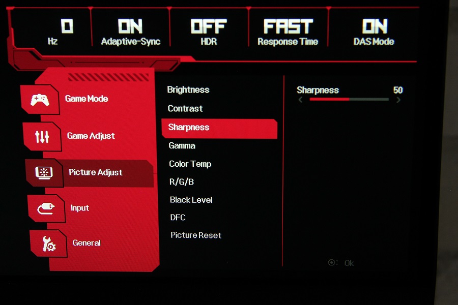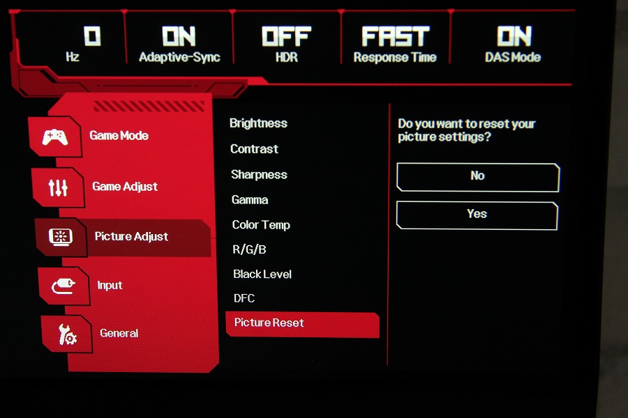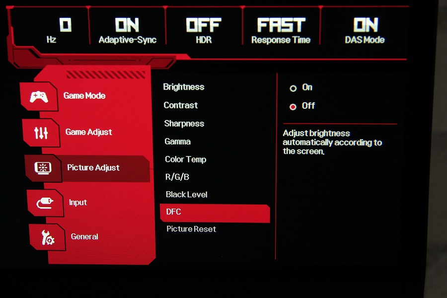 Gaan we vervolgens kijken naar de Picture Adjust, waar verschillende instellingen aangepast kunnen worden voor het tonen van het beeld. Denk hierbij aan de helderheid, het contrast, de scherpte, de kleurtemperatuur, de RGB instellingen en DFC (Digital Fine Contrast) wat er voor moet zorgen dat de helderheid zich automatisch aan past aan het beeld.
