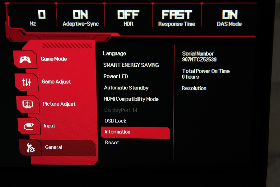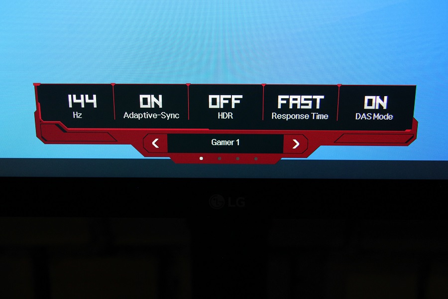 Kijk we naar de settings van het scherm dan zien we bovenin een balk met daarin dezelfde vijf opties als te zien waren bij de Game Mode. Dit zijn de verversingssnelheid van het scherm, de Adaptive-Sync, de HDR optie, de Responstijd en de DAS (Dynamic Action Sync) Mode. Zo is makkelijk en snel te zien welke belangrijke instellingen voor gamers ingeschakeld zijn en op welke stand.
