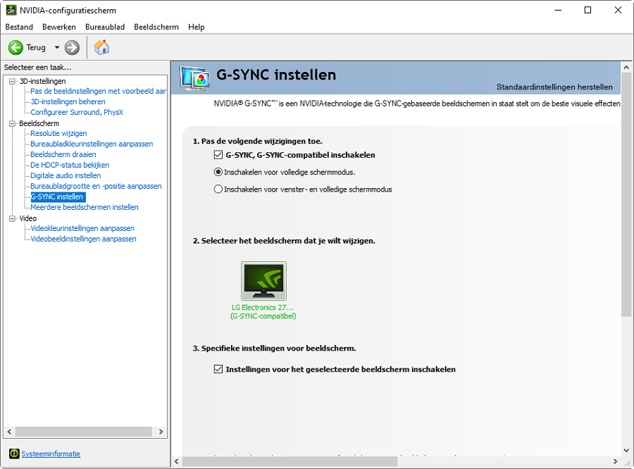 Zo kom je meteen op de juiste pagina terecht waar je G-Sync in kan schakelen. Hier is ook te kiezen of je het alleen wilt voor programma's die in full screen modus draaien of dat het ook mag gelden voor applicaties die in een venster draaien. Kies vervolgens ook voor welk scherm het actief gezet moet worden (ook al is hier maar één scherm op aangesloten).