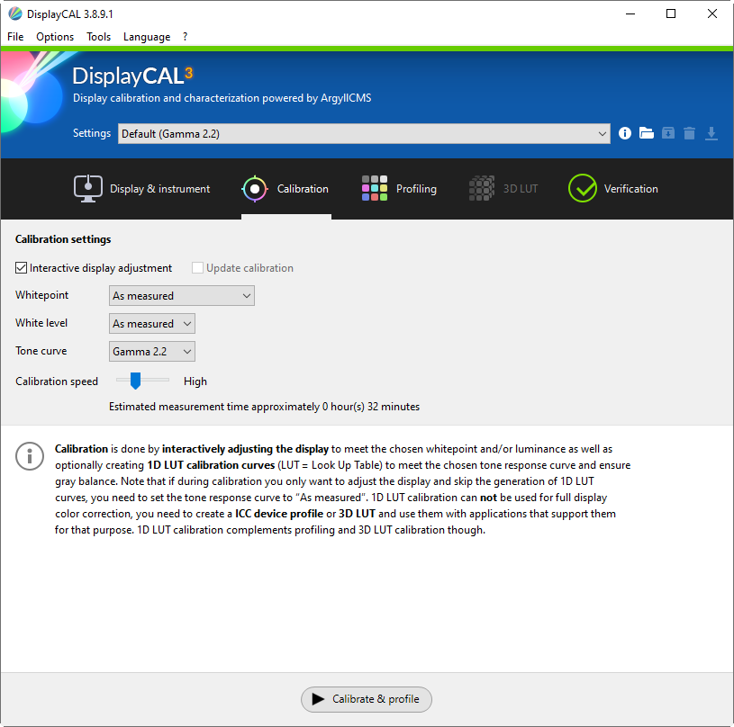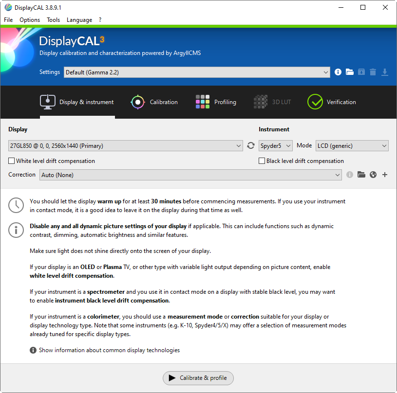 Tijd om een calibratie op het scherm los te laten. Ik heb geprobeerd om de software van Datacolor zelf te gebruiken maar op een of andere manier worden de instellingen niet opgeslagen. Vandaar dat we overgestapt zijn naar Displaycal.
