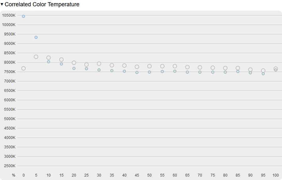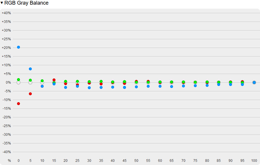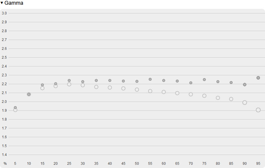 Het lijkt erop dat de kleurtemperatuur net ietsjes te hoog ligt maar dat is vrij makkelijk aan te passen. Het gamma lijkt in orde te zijn net zoals de kleurbalans. Het Gamma is aan het eind van de test ietsjes uit balans maar dat is op zich niet zo'n probleem. De Gamut waardes lijken ook in orde te zijn. Het ziet er dus naar uit dat het scherm goed gekalibreerd is vanuit de fabriek.