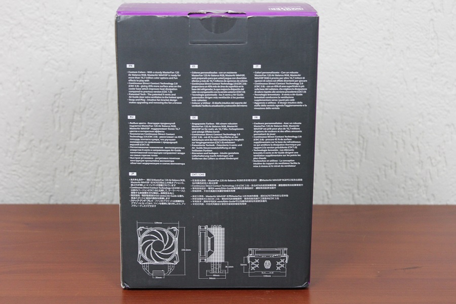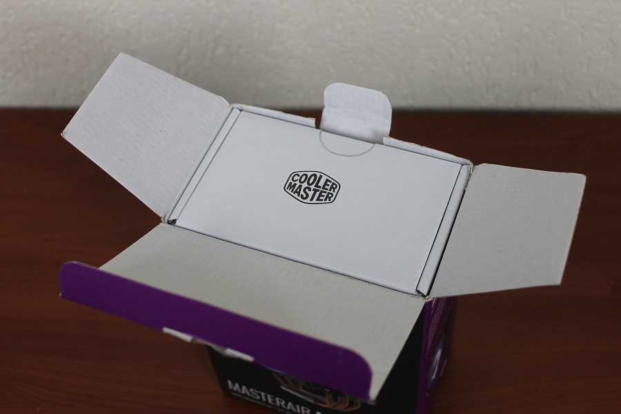 De kleurstelling van de doos zal niemand verbazen. Het paarse is de kleur die Cooler Master al jaren gebruikt en mag daarom niet ontbreken op de doos. Op de voorkant zien we groot een afbeelding van de koeler met daaronder de naam van het product. Bovenin zien we nog het logo en het feit dat de verlichting (alle 16,7 miljoen kleuren) werkt met de RGB protocollen van de verschillende moederbord fabrikanten. Op de achterkant van de doos zien we een aantal van de features en een tekening met de maten van de koeler. De doos is vrij makkelijk via de bovenkant open te maken door een stikker door te snijden en een lipje los te halen. Klappen we de doos open dan zien we een wit doosje liggen.