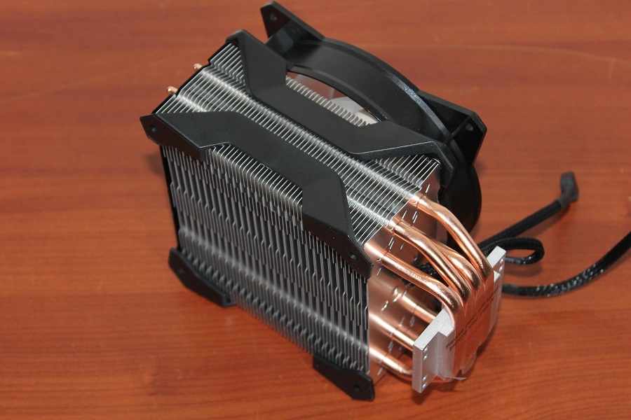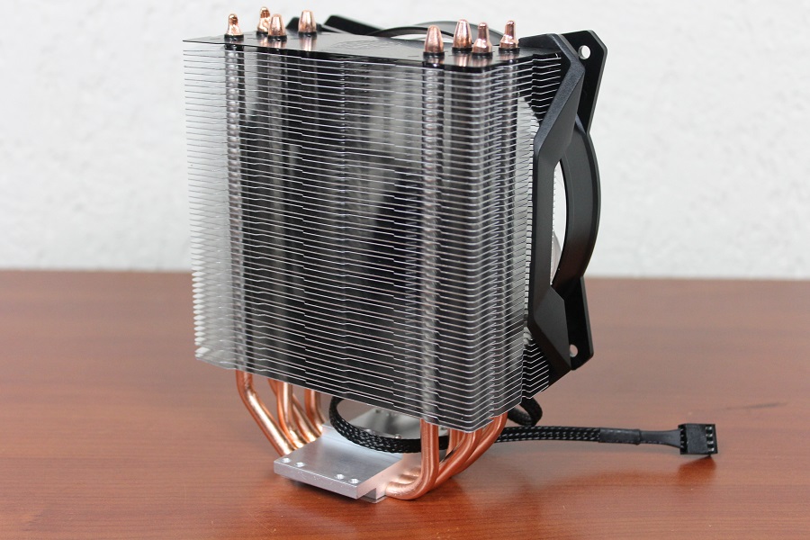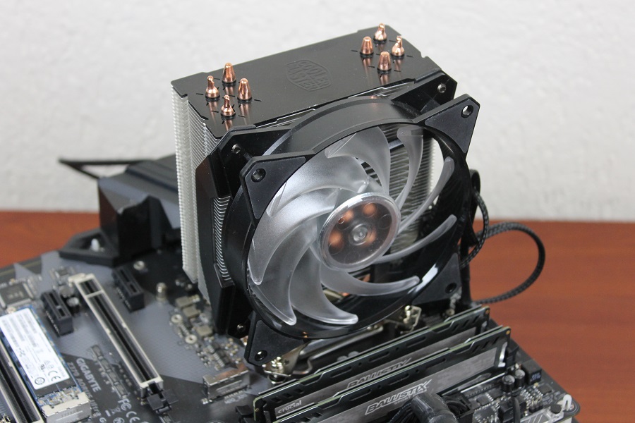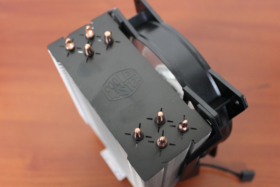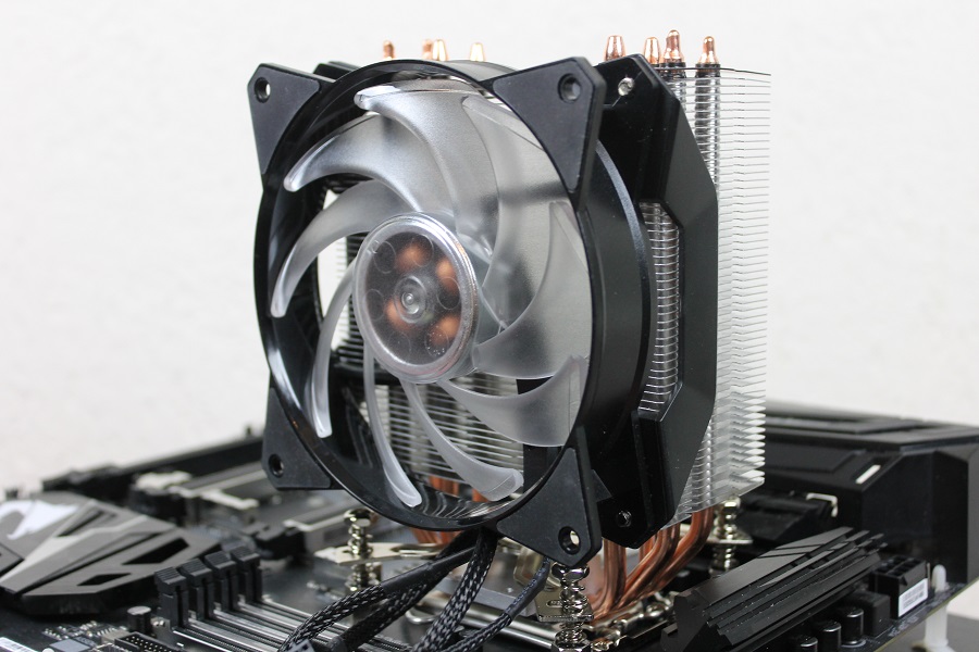 De ventilator die al op de koeler zit is een 120mm Masterfan ventilator waar twee brackets op geschroefd zitten. Zo kan de ventilator makkelijk verwijderd worden of juist weer terug geplaatst (wat ook nodig is voor de installatie). Cooler Master levert nog een set clips mee waarmee een extra ventilator op de koeltoren geklikt kan worden zodat er nog meer airflow is. De ventilator is voorzien van twee aansluitingen: de eerste is om de ventilator aan te sturen, de tweede is om de verlichting van de ventilator aan te sturen. Deze kan aangesloten worden op de meegeleverde RGB controller of op de connector van het moederbord.