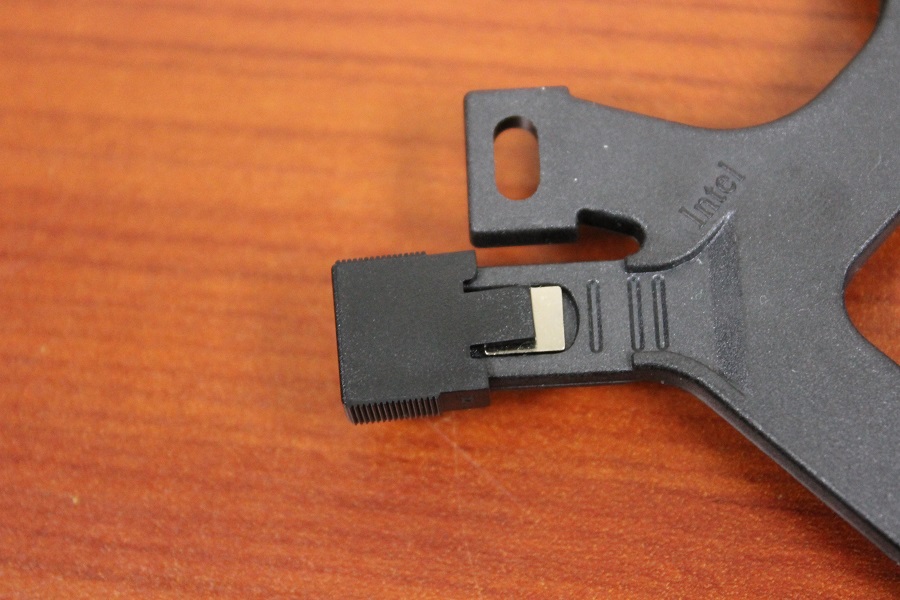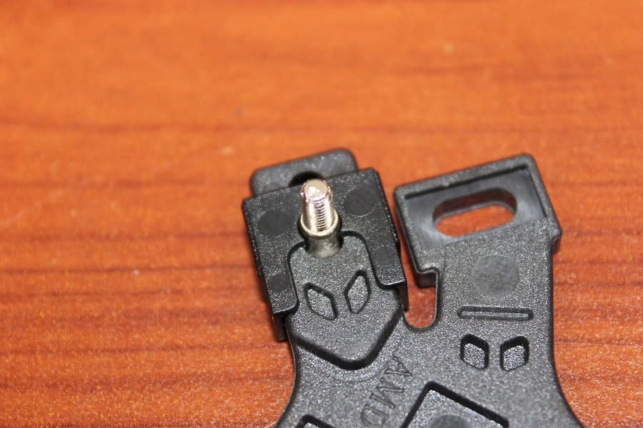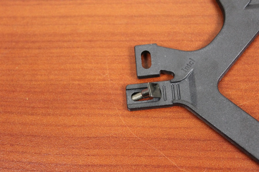 Het geleverde bracket kan voor borden van beide processor fabrikanten gebruikt worden. Afhankelijk van welke processor er geplaatst wordt moet het bracket omgedraaid worden. De brede clips zijn voor AMD, de smallere zijn bedoeld voor Intel. Bij de accessoires worden pinnen geleverd. Hier komen straks moeren op die er weer voor zorgen dat de koeler vastgezet kan worden. Stop deze in een opening en plaats daarna de clip. Let er wel op dat de pen ook goed vastgezet wordt in de clip. Uiteindelijk kan de clip nog afgesteld worden voor de verschillende formaat openingen die Intel voor de verschillende sockets heeft. Let hier wel op anders kan de backplate niet geplaatst worden.
