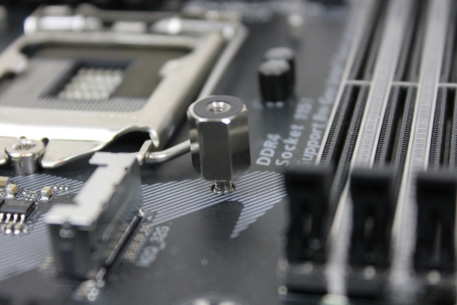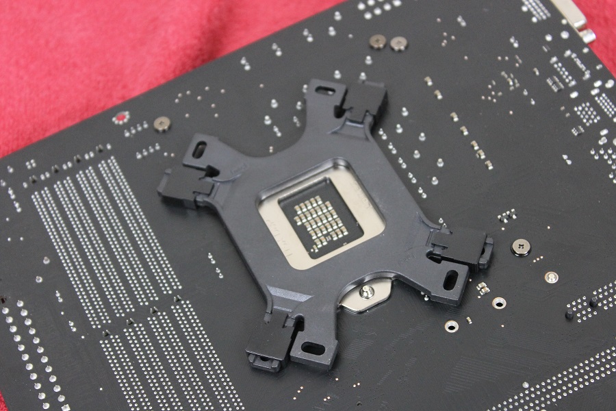 Nu dit gedaan is kan het backplate op het bord geplaatst worden. Mochten de pinnen nog niet goed zitten dan kunnen deze nog verschoven worden. Als alles goed gaat zijn aan de andere kant van het bord de pennen te zien. Hier kunnen nu de moeren op vastgedraaid worden. Dit kan gewoon met de hand gedaan worden maar Cooler Master levert nog een dop mee waarmee de moeren strakker vastgedraaid kunnen worden. Uiteindelijk zijn op alle vier de hoeken de moeren te zien.