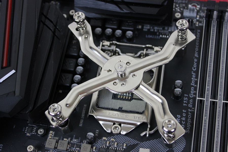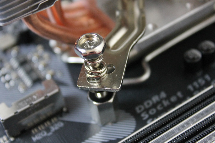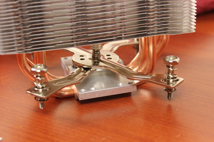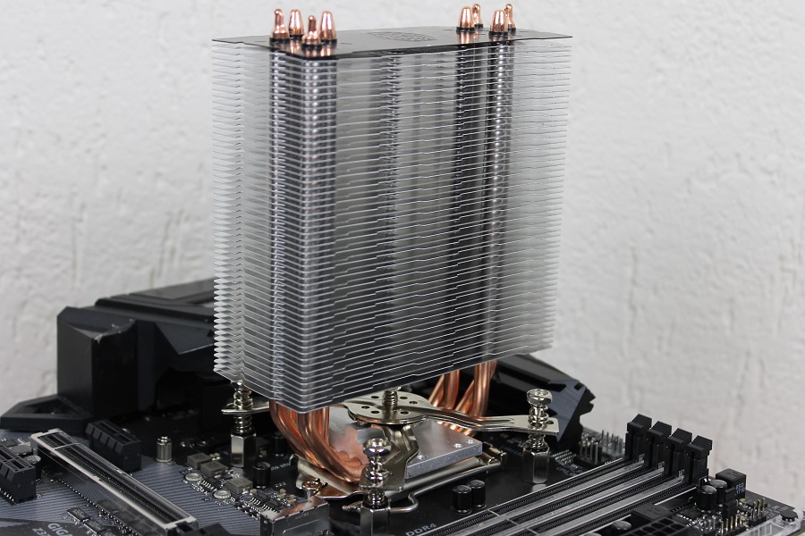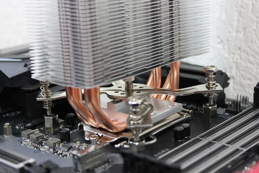 Mocht je willen kijken of alles past of welke stand gebruikt moet worden voor de koeler dan is het mogelijk om alvast de "spinnenpoot" vast te zetten op de eerder gemonteerde moeren. Mocht het nodig zijn dan kan een en ander nog aangepast worden. Haal alles weer los als je weet welke stand gebruikt moet worden. Doe nu wat koelpasta op de processor om eventuele oneffenheden op te vullen. Steek het bracket tussen de heatpipes door zodat deze uiteindelijk het blok vast kan zetten op de processor. Let er wel op dat deze in het midden een pin heeft die precies in de koeler valt. Pak het geheel op en plaats dit op het bord. Bevestig het bracket aan het bord door de vier schroeven vast te zetten. Doe dit wel in kruisvorm zodat de koeler netjes vastgezet wordt. Mocht er toch iets niet passen dan is het mogelijk de schroeven op een iets andere plek te plaatsen. Als alles vast zit zien we de toren netjes op het bord zitten.