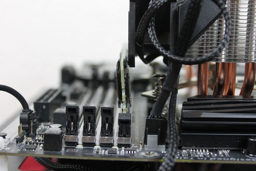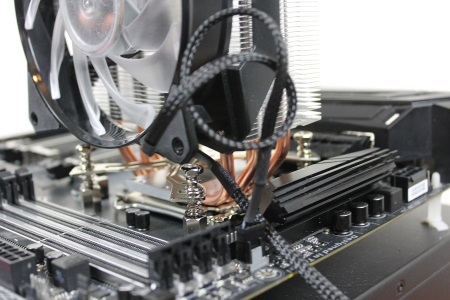 Het enige wat nog moet gebeuren is het plaatsen en aansluiten van de ventilator. De meegeleverde ventilator is al voorzien van clips dus het is een kwestie van de ventilator op het blok klikken en klaar. Daarna moeten de connectoren van de 4-pins PWM aansluiting en RGB aansluiting nog op het bord geprikt worden. In dit voorbeeld wordt er gebruik gemaakt van een verloopkabel voor de RGB aangezien het bord een RGBW connector heeft. Let overigens wel op de geheugenbanken. Als de ventilator normaal geplaatst wordt is de eerste bank niet bruikbaar tenzij je het geheugen onder druk wilt zetten. Kijk hierbij uit wanneer je alle geheugensloten in gebruik hebt. Het geheel ziet er strak uit.