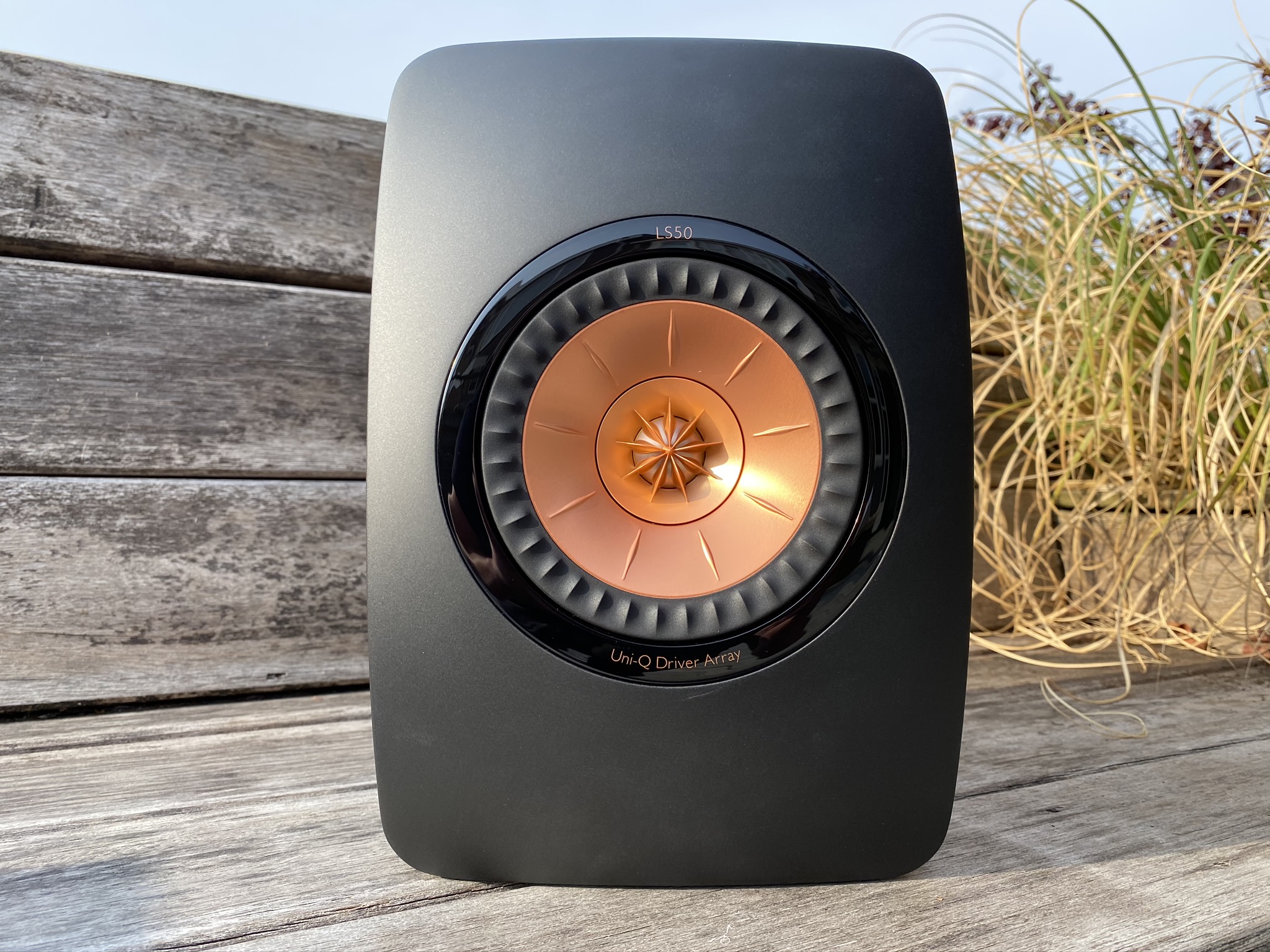 Door naar de speakers zelf. Het is al een tijd geleden dat ik stil stond bij de “daar word ik nou vrolijk van” uitdrukking van Rob Geus. Dit omschrijft mij gevoel toen ik de LS50’s voor het eerst zag. De totale scené met de blauwe lucht wat die avond ideaal. Ik kon op dat moment alleen maar genieten. De Uni-Q Driver Array met koperkleurige conus springt heerlijk uit het ontwerp.