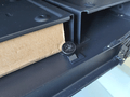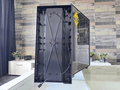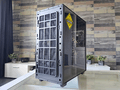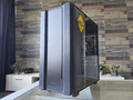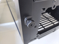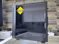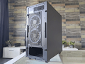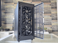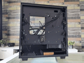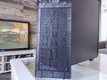 Vervolgens werpen we een blik op de zijkanten, waarbij het glazen zijpaneel een typerende weerspiegeling bezit. Aan de andere kant treffen we een soliede paneel aan. In beide gevallen zijn de panelen bevestigd met duimschroeven. Iets minder “chic”, maar wel praktisch.