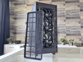 Opvolgend komen we aan bij de andere kant van de behuizing. Daar is een gedetailleerde blik te werpen op het uiterlijk van de RGB-fans. Oh, en de gedraaide lay-out natuurlijk. Daar zien we de doorgangen voor de 24-pins-voedingskabel van het moederbord en de kabels voor de videokaart.