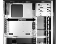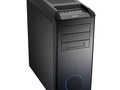De deur-loze voorkant wordt gekenmerkt door een chique blauw oplichtende cirkel wanneer de computer aanstaat, met daarboven plaats voor 3x 5.25" drives (of 2x + 1x floppy).