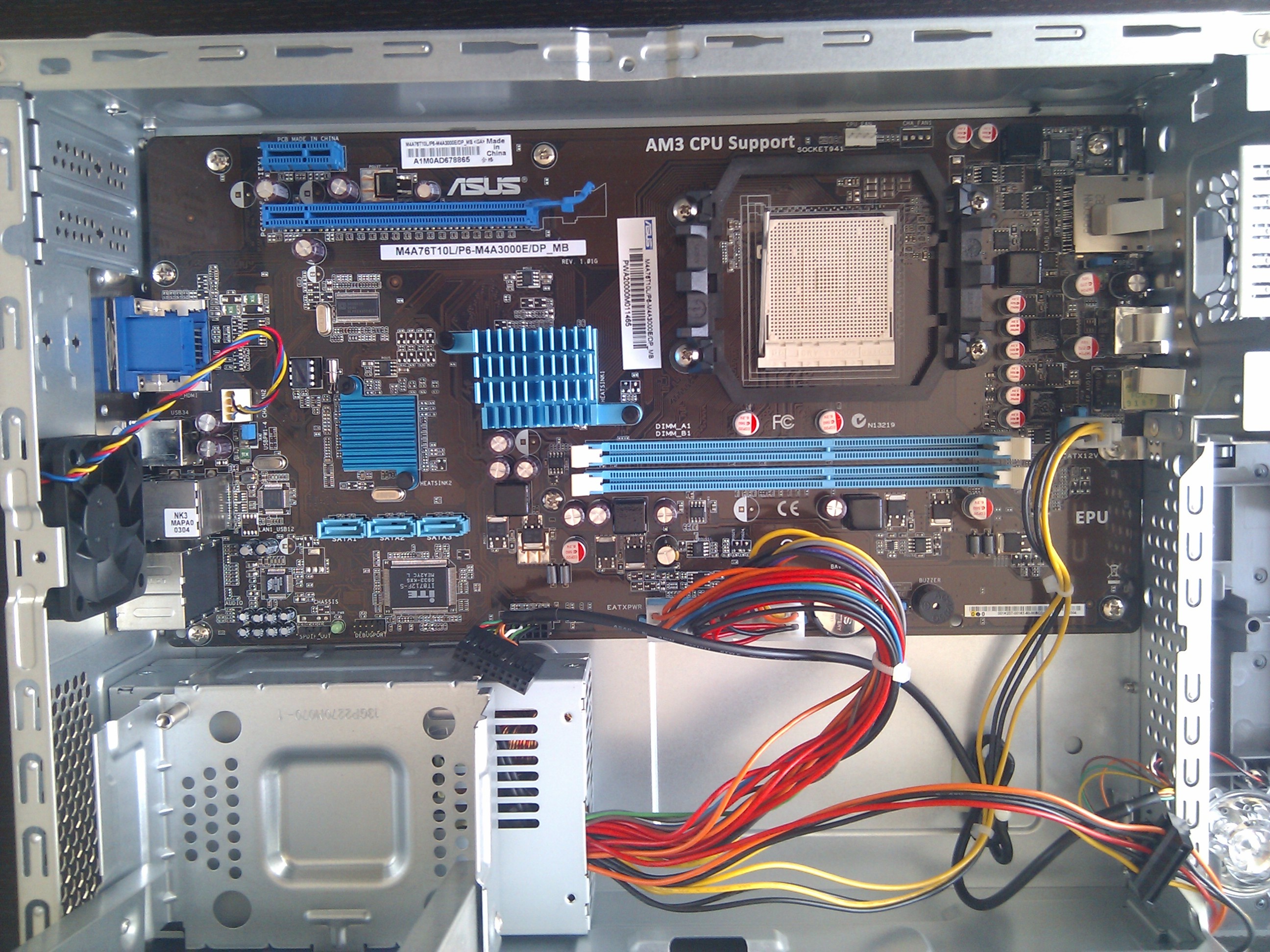 Het moederbord heeft een AM3 socket en heeft een RS780 chipset. Deze zorgt ervoor dat hij een onboard GPU heeft die UVD ondersteund (AMD versie van DXVA als ik het goed begrijp) en DirectX 10. Ook is er plek voor twee reepjes DDR3 geheugen, en is er een PCI-e 1x en een PCI-e 16x slot. Deze moeten wel low profile zijn anders passen ze er niet in. Je kan geen horizontale converter gebruiken om er een langere kaart in te steken zonder de kast te moeten modden. Ook heeft asus al standaard een kleine 8cm fan ingebouwd, welke erg stil draait.
