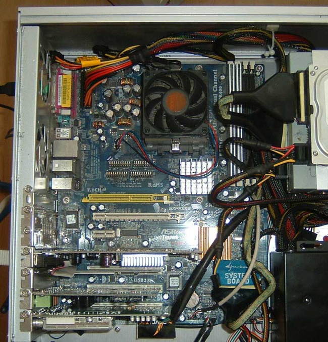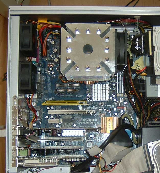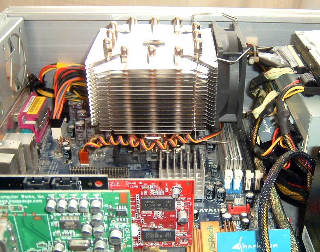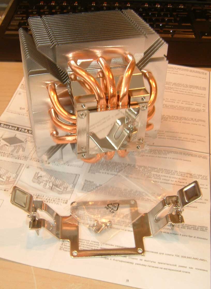 Omdat de voeding van mijn HTPC het had begeven en dit systeem dus toch weer eens uit de kast en uit elkaar moest, heb ik meteen van die gelegenheid gebruik gemaakt om de processorkoeler te vervangen. Ik ergerde mij de laatste tijd namelijk aan het gezoem en het gebrom die de OEM koeler op mijn X2 3800+ maakte. Ook werd het systeem eigenlijk veel te warm, mede door de 3 harde schijven, de passieve videokaart, en de bijna afgesloten wandkast waar hij instaat