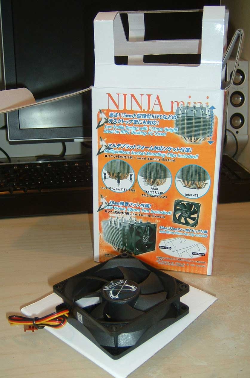 De koeler wordt verkocht in een stevige oranje doos. Na het openen kijk je eerst tegen de 80mm ventilator aan. Hieronder is onder een kartonnetje het koellichaam verstopt, en daaronder ligt een kleiner doosje met 3 verschillende brackets, de schroefjes om die op het koelblok te monteren, beugeltjes voor montage van een 80mm en 90mm ventilator, een zakje koelpasta en de installatie instructies.