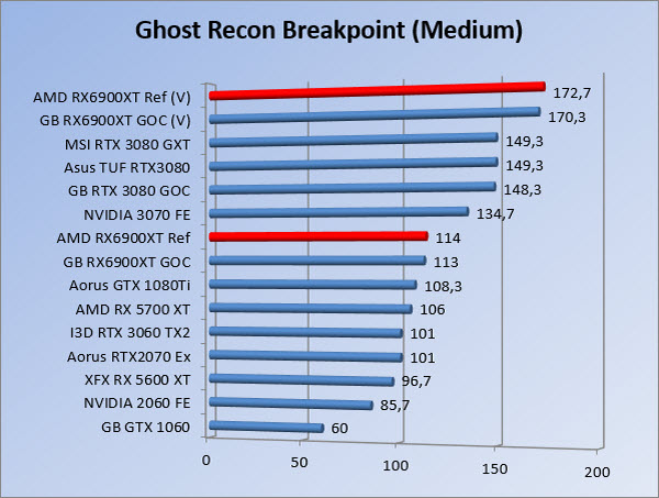 Gaan we de resolutie omhoog gooien naar 1440P dan komt de kaart al wat beter uit de verf. Echter blijven sommige spellen een probleem houden met de videokaart. Far Cry 5 werkt niet echt soepel met dit spel waardoor de scores blijven hangen in de buurt van de RTX 3070, een kaart die de helft moet kosten van de 6900XT. Hetzelfde geldt voor Deus Ex en Ghost Recon. Laatst genoemde presteert wel beter wanneer het spel gestart wordt met de Vulcan API. Ook qua Raytracing performance zit de kaart rond de 3070 van de tegenpartij maar dat is iets wat eigenlijk wel verwacht werd. De AMD reference kaart presteert over het algemeen iets minder goed dan de Gigabyte kaart maar de kloksnelheden van laatstgenoemde liggen ook ietsjes hoger.