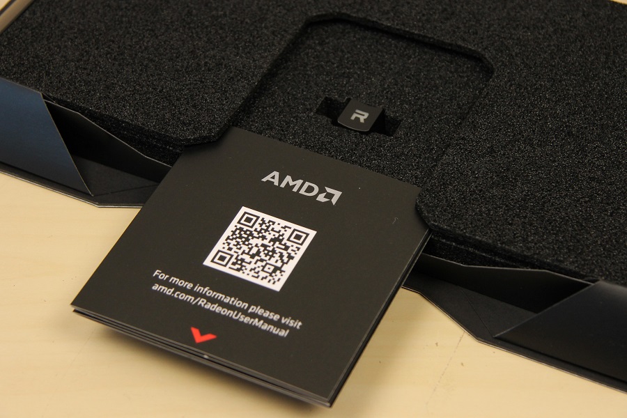 De voorkant van de doos ziet er netjes uit. We zien over de hele doos een afbeelding van de videokaart staan. Rechts bovenin zien we dan de baan van de videokaart. Op de achterkant van de doos zien we het internet adres terug waar de handleiding en de garantievoorwaarden staan. Onderin zien we een aantal logo's. Klappen we de doos open dan zien we op de flap een stuk tekst staan over het Red Team, de kleur van AMD. Op het losse gedeelte staat weer de kaart afgebeeld samen met een paar van de features. Als we deze omdraaien dan zien we daar toch nog iets van een papiertje zitten. Dit is een QR code met de URL van de handleidingen. Zodra deze uit de verpakking gehaald wordt zien we nog een keycap in de verpakking zitten. Een leuk extraatje. Als we de aandacht weer verleggen naar de doos dan zien we een rol liggen. Dit is de videokaart die ingepakt is in een muismat, nog een leuk presentje dus.