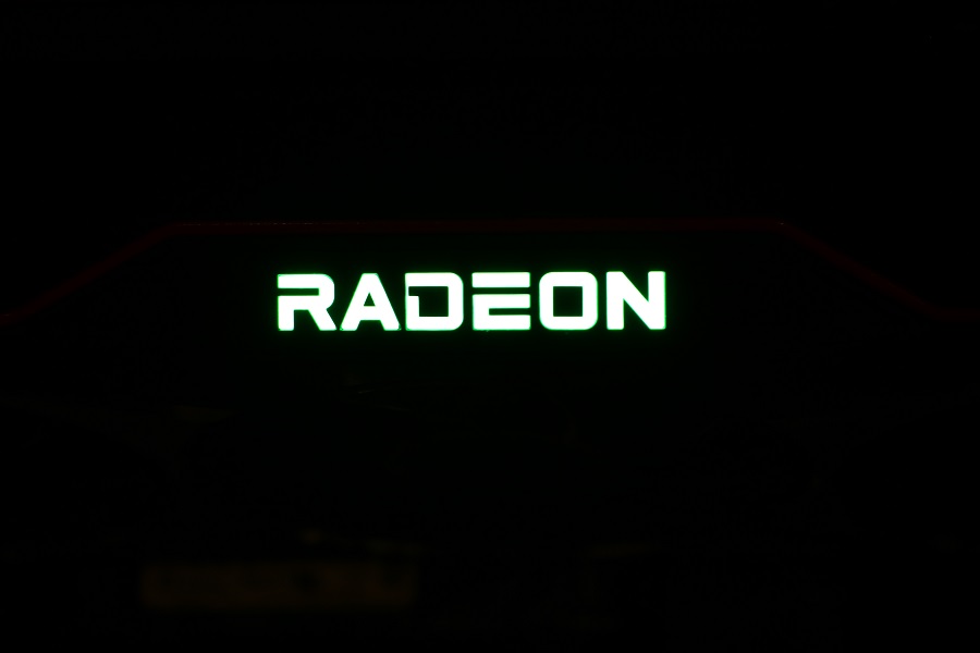 De drie ventilatoren lijken niet heel erg bijzonder te zijn. Je ziet aan de binnenkant van de ventilator wel iets van een lijn zitten maar daar is ook alles mee gezegd. Ze draaien allemaal in dezelfde richting. Sommige fabrikanten kiezen ervoor om de middelste ventilator de andere kant uit te laten draaien zodat warme lucht twee kanten opgeblazen wordt. Verder zijn de ventilatoren voorzien van een sticker met een grote R, wat verwijst naar Radeon. Bovenop onder een hoek van 45 graden zien we deze Radeon naam weer terug komen. Dit is tevens de enige verlichting die je op de kaart zult aantreffen. Wel is deze, in tegenstelling tot de 6700XT en 6800 kaart, uitgevoerd met RGB verlichting. Hier later meer over.