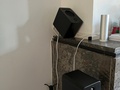 De plaatsing is denk ik niet ideaal, maar beter kreeg ik het hier thuis niet voor elkaar (sowieso dat de TV in de hoek staat en de schouw in het midden). Ik wilde niet zomaar sleuven in de muur gaan freezen om de speakers boven aan het plafond naar beneden gericht te kunnen hangen. Dus nu schuin geplaatst op de schouw en recht omhoog achter de TV.