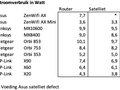Noot: geen metingen van de Asus AX Satelliet want voeding defect. Kon wel testen met alleen de Satelliet werkend, maar een niet-connected satelliet (zoekende naar de Router) leek me geen representatieve test.
