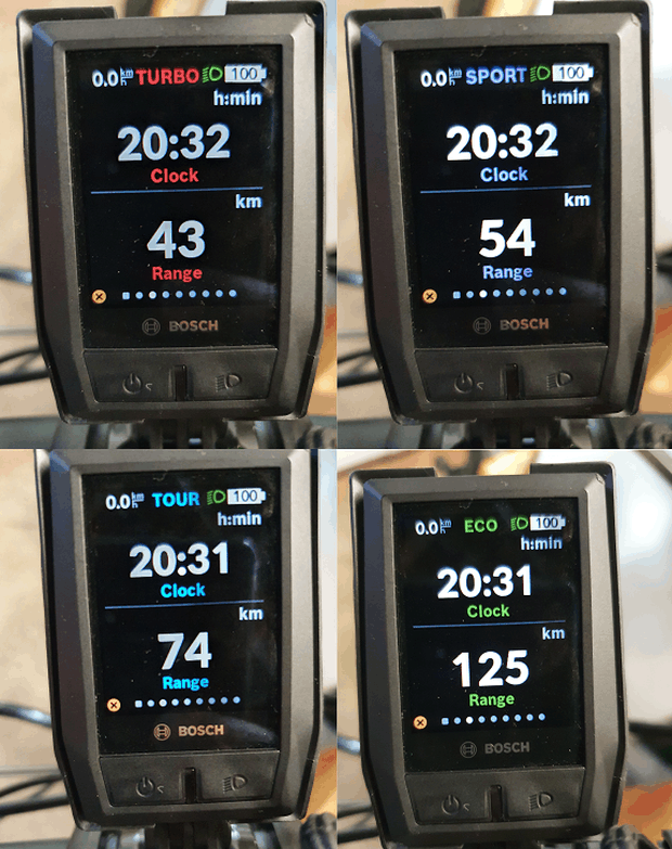 Op de turbostand geeft de het Kiox Bosch display aan dat je 43 km kunt rijden. Maar in de sport stand 54 km, in de tour stand 74 km en als je alle tijd hebt in de eco stand 125 kilometertjes. Dit is natuurlijk sterk afhankelijk van de weersomstandigheden, de route en je eigen motivatie.