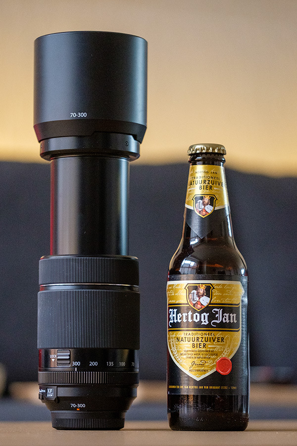De XF 70-300 is iets groter dan de 50-230 en kent een lengte van zo’n 14,5cm op 70mm. Op 300mm wordt dat zo’n 22cm, waar de zonnekap nog 6,5cm aan toevoegt waarna het geheel op maximaal 28,5cm komt. De diameter is zo’n 7,5cm en het gewicht bedraagt zo’n 655 gram, waarmee de lens zo’n 50% zwaarder is dan de 50-230, maar nog steeds prima als reisgezelschap op langere wandelingen.