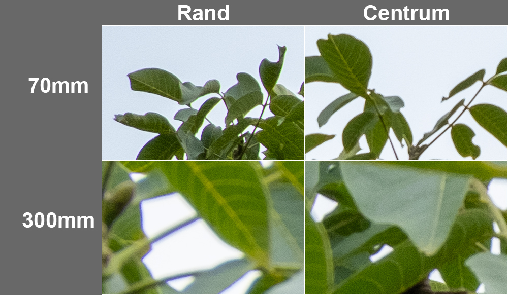 Op de uiterste tele-stand (300mm) zien we een flinke achteruitgang in scherpte. Ik heb dit nog een tweede keer getest met een afstandsbediening om elke trilling uit te sluiten, maar dat gaf vergelijkbare foto’s op. F8.0 is het enige diafragma wat scherp te noemen is. In het centrum mag je F11 mogelijk ook nog als ‘scherp genoeg’ rekenen, maar alle andere diafragma-standen zijn onscherp. Het zou kunnen dat de wind net te sterk was om de camera echt compleet vrij van trilling te houden. Ik wilde echter niet naar een hogere ISO gaan, om zo ruis te voorkomen. |