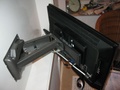 De (VESA 100) aansluiting voor de steun zit boven het midden van de monitor en redelijk dicht bij de connectoren. Met de Vogels EFW8145 muursteun werd dit lastig, de strips die op de TV moeten steken enkele millimeters over de connectoren heen, past dus net niet. Dit heb ik opgelost door het verwijderen van de plastic verdikking van de borgschroeven van de D/sub connector en een klein inhammetje in strip te vijlen. Een ander probleem van de VFW 8145 steun was dat hij ingevouwen niet op het centrale punt hing. De TV hing ingevouwen ca 20 cm naast de plek waar de beugel in de muur was geschroefd, in mijn geval was dat geen gezicht. De Vogel's steun van type VFW 426 past wel goed en de TV belandt na invouwen mooi voor de muurmontage. De TV/monitor treft hier geen blaam.