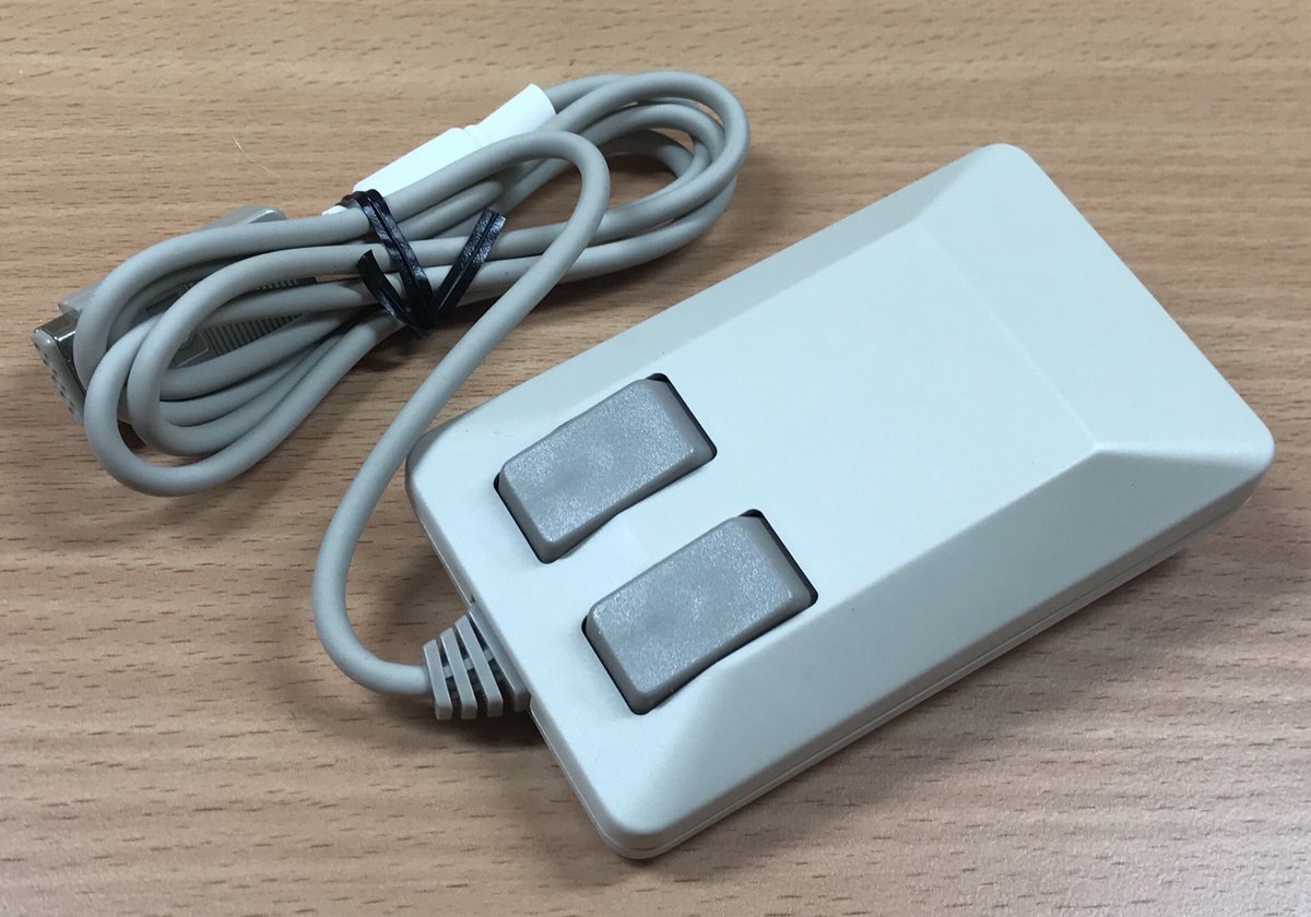 Amiga tank-muis. De knoppen lijken zompig, maar hebben een duidelijke klik in de praktijk. Het is geen bal-muis maar een optische muis welke prima functioneert zonder muismat.