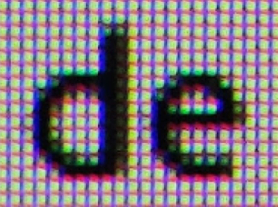 Tot slot lijken er "kleurartefacten" te zien zijn bij contrastrijke randen (zoals zwarte tekst op een witte achtergrond), misschien is dit inherent aan OLED, misschien is dit goedkoop. Zie de bijgevoegde afbeelding voor een voorbeeld. Het is in ieder geval niet zeer storend, gezien ik met rustige kleurenthemas werk en het artefact alleen zichtbaar is bij een heel hoog contrast, en ook alleen bij zwarte tekst op een witte achtergrond. Oordeel zelf of dat acceptabel is