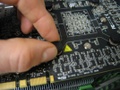 De koeler wordt nu nog vastgehouden door de plakkerige koelpasta en de heatpad’s van het geheugen en de vrm’s. Met beide handen trek je de koeler en kaart van elkaar los. Beweeg heen en weer. Daar waar je de meeste weerstand voelt, trek je iets harder. Doe het voorzichtig, want je wil niet dat de kaart te veel buigt. Ik denk dat het helpt als de kaart warm is, omdat de koelpasta dan minder stijf is. Als de koeler los komt, moet je het ventilatorkabeltje nog losmaken van de videokaart.