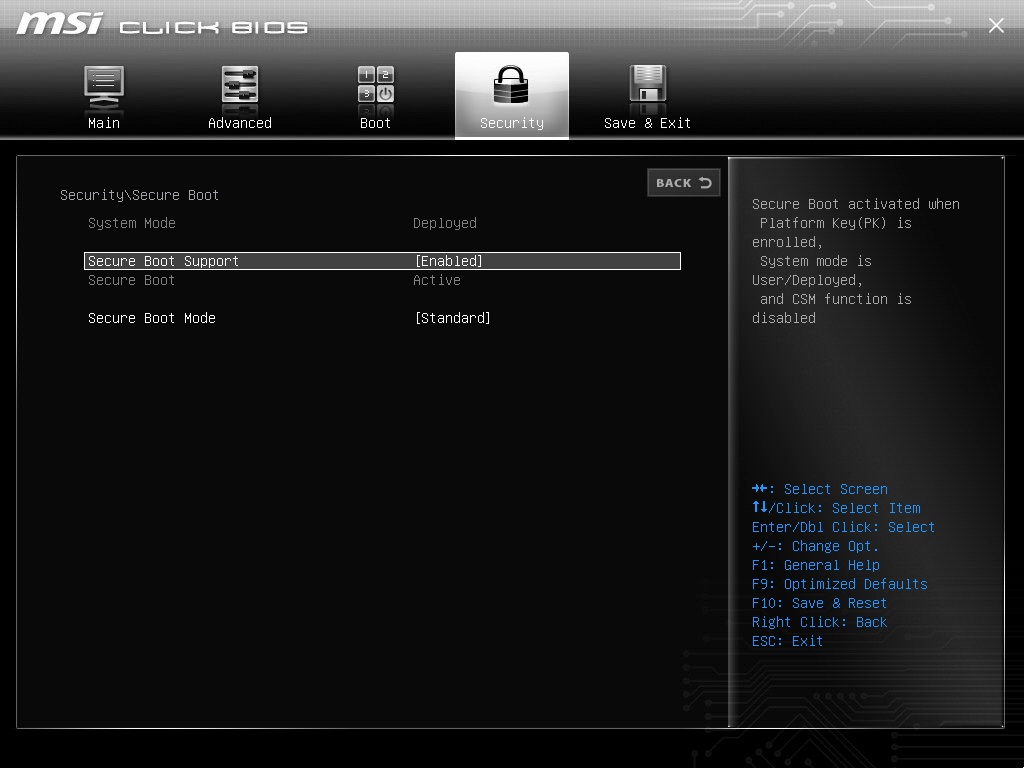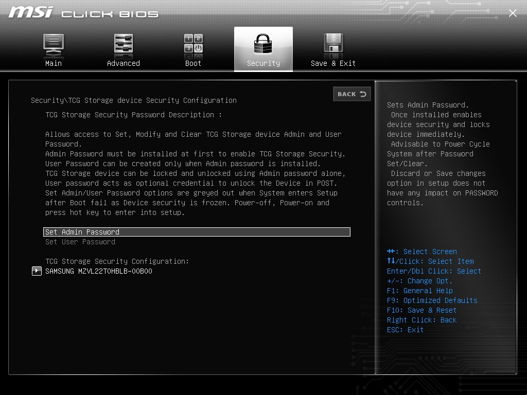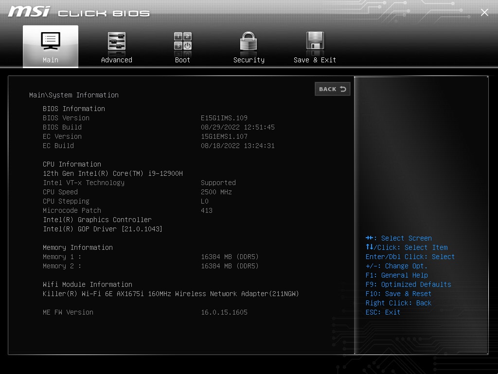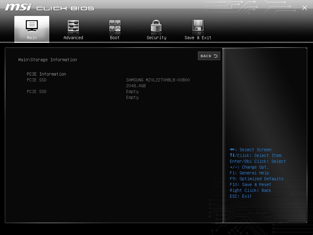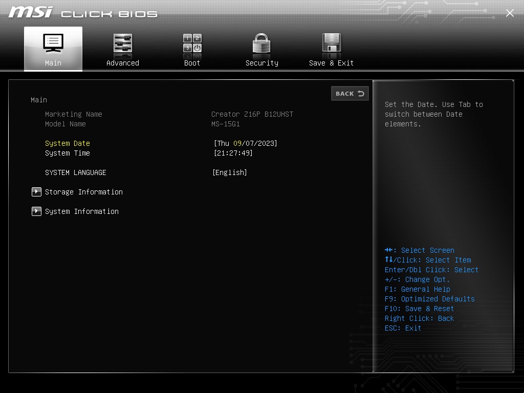 In het eerste scherm van de Bios zien we dat er vijf verschillende opties zijn: Main, Advanced, Boot, Security en Save & Exit. We gaan even snel door de verschillende schermen heen. Het eerste scherm toont de datum en tijd. Deze kunnen hier ook aangepast worden, net als de taal van de Bios. Onderin zijn nog twee opties te zien. Bij Storage Information zien we hoeveel opslag er in de laptop zit en het typenummer. In dit geval is er één slot leeg en is het andere slot voorzien van een Samsung 2TB ssd. De andere optie laat precies zien wat er zich in de laptop bevindt, van de processor tot het geheugen en de netwerkkaart.